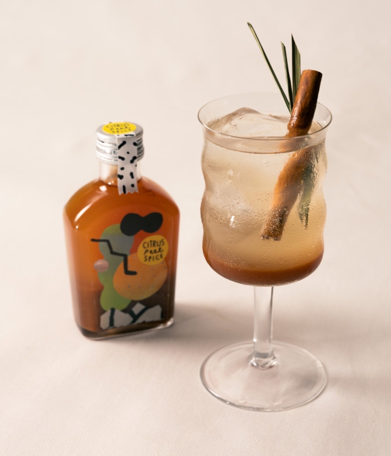 開発のヒントを得たのは、リサーチのため訪れた、バーやエスニックレストランでした。バーでは、美味しいと感じる飲み物には苦みと香りがあることに気がつきました。ベトナムレストランでは、ミントとお肉を合わせた時の強烈な香りと塩味の掛け合わせに出会い、インドレストランでは、アチャール(インド風漬物)に使われていたザラザラとしたスパイスとシトラスピールの絶妙なバランスを味わい、着想を得ました。このような研究を通し、約1年試作を繰り返して、口に含んだ瞬間「香り」と「味のパンチ」が広がる、特別なアップサイクルシロップが出来上がりました。