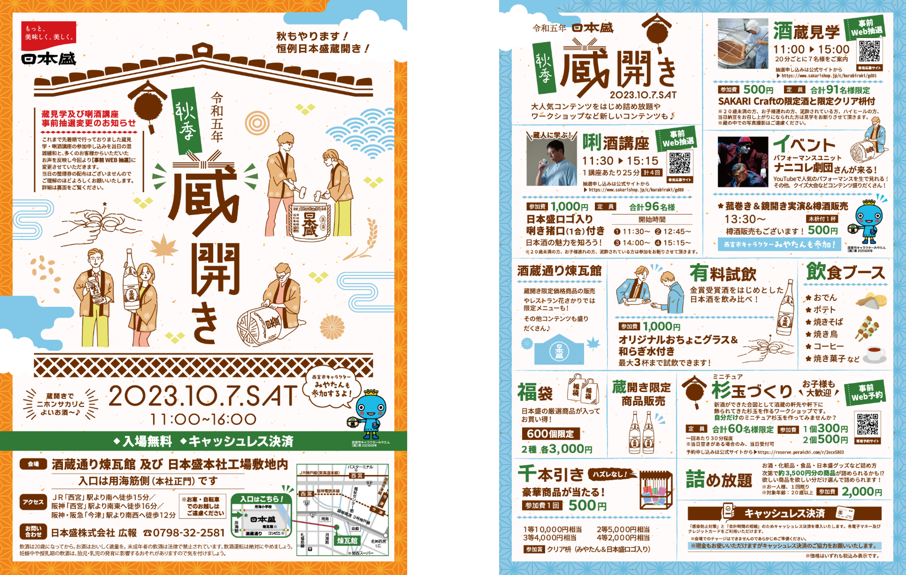 当イベントは4年ぶりの開催となります。前回開催した新酒蔵開きからパワーアップし、新企画として日本盛商品の詰め放題、ミニチュア杉玉づくり、千本引きを追加いたしました。また、これまで先着順で行っておりました蔵見学及び唎酒講座の参加申し込みを当日の混雑緩和と多くのお客様から頂いたお声を反映し事前WEB抽選に変更させていただきました。事前WEB抽選の申し込み及び詳細は下記サイトをご確認ください。