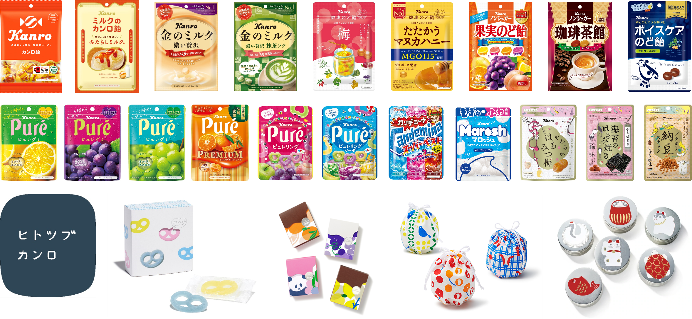 当社は1912年の創業以来、社名になっている「カンロ飴」を始め、菓子食品業界で初ののど飴となる「健康のど飴」、ミルクフレーバーキャンディ市場売上No.1ブランド※1「金のミルク」、大人向けグミの先駆けでありグミの売上トップブランド※2である「ピュレグミ」など、生活者の皆さまから愛される商品を創り続け、成長してまいりました。直営店「ヒトツブカンロ」では、「ヒトからヒトへ つながる ヒトツブ」をコンセプトにキャンディの魅力を発信しております。