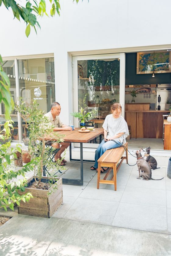 店内は、陽の光が優しく差し込み、コンクリートの打ちっぱなしの内装に、木彫家具とたくさんの植物で、とても気持ちの良い空間です。屋外には、愛犬と一緒に食事やドリンクを楽しんでいただけるテラス席を設けました。