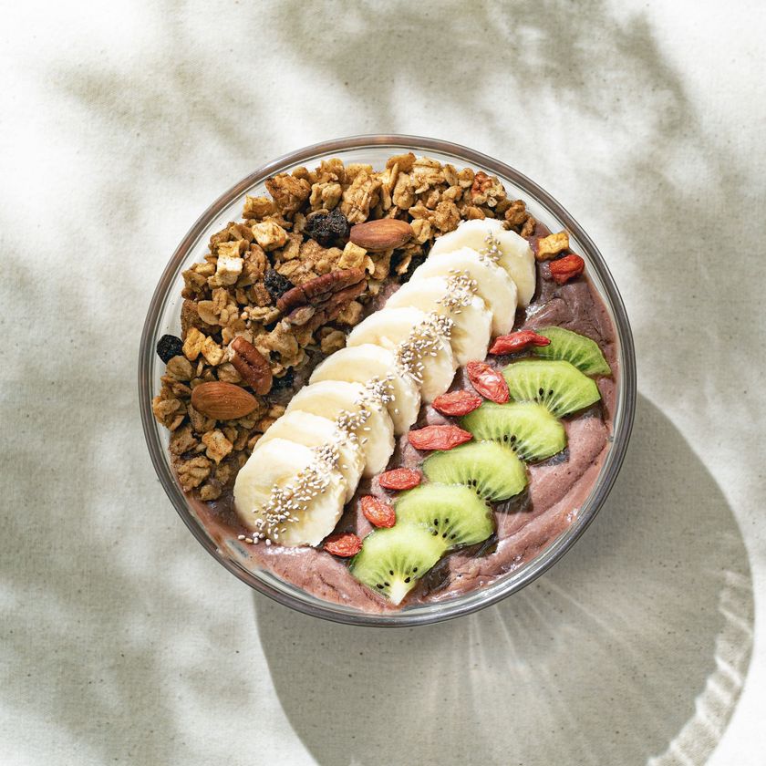 ブラジル産のアサイーピューレを使ったスムージーボウル。有機素材で作ったシナモンアップルグラノーラやフルーツを乗せています。恵比寿店の人気No1メニューです。