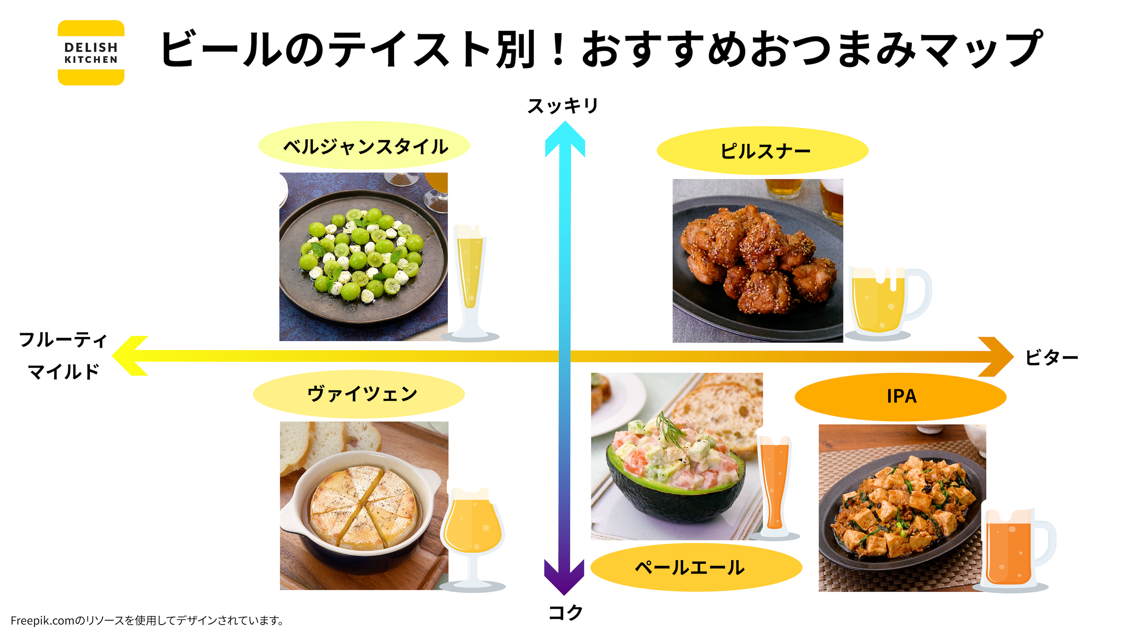 『DELISH KITCHEN』では、ビールのテイスト別にペアリングしたいおつまみレシピの特集を公開しました。