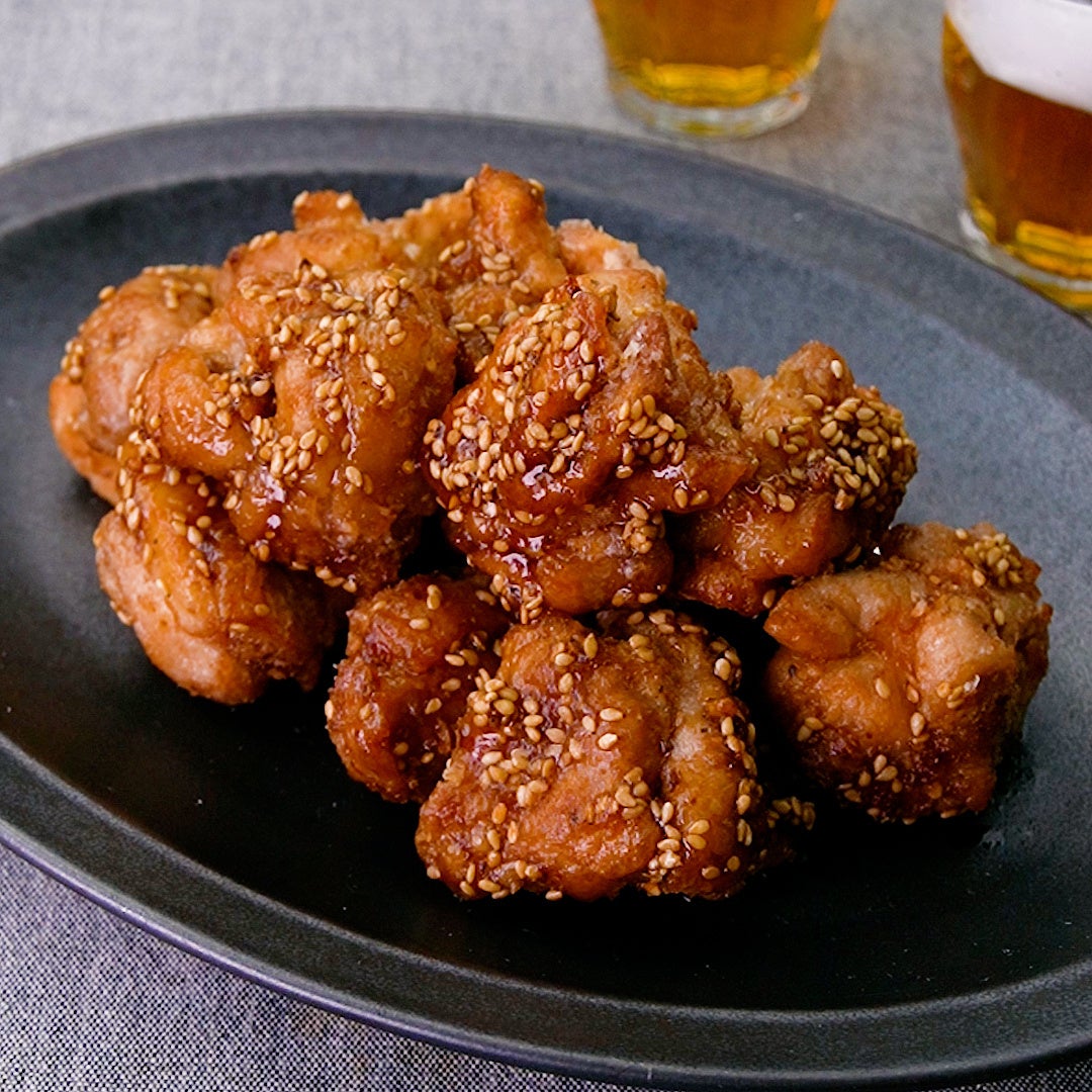 揚げてから甘辛いたれをまとわせる背徳感のあるからあげ!ごはんもお酒も進みます♪下味にかつお節を入れることでマヨネーズの衣が鶏肉にからみやすく、口に入れた時にもかつお節のうまみが広がります!