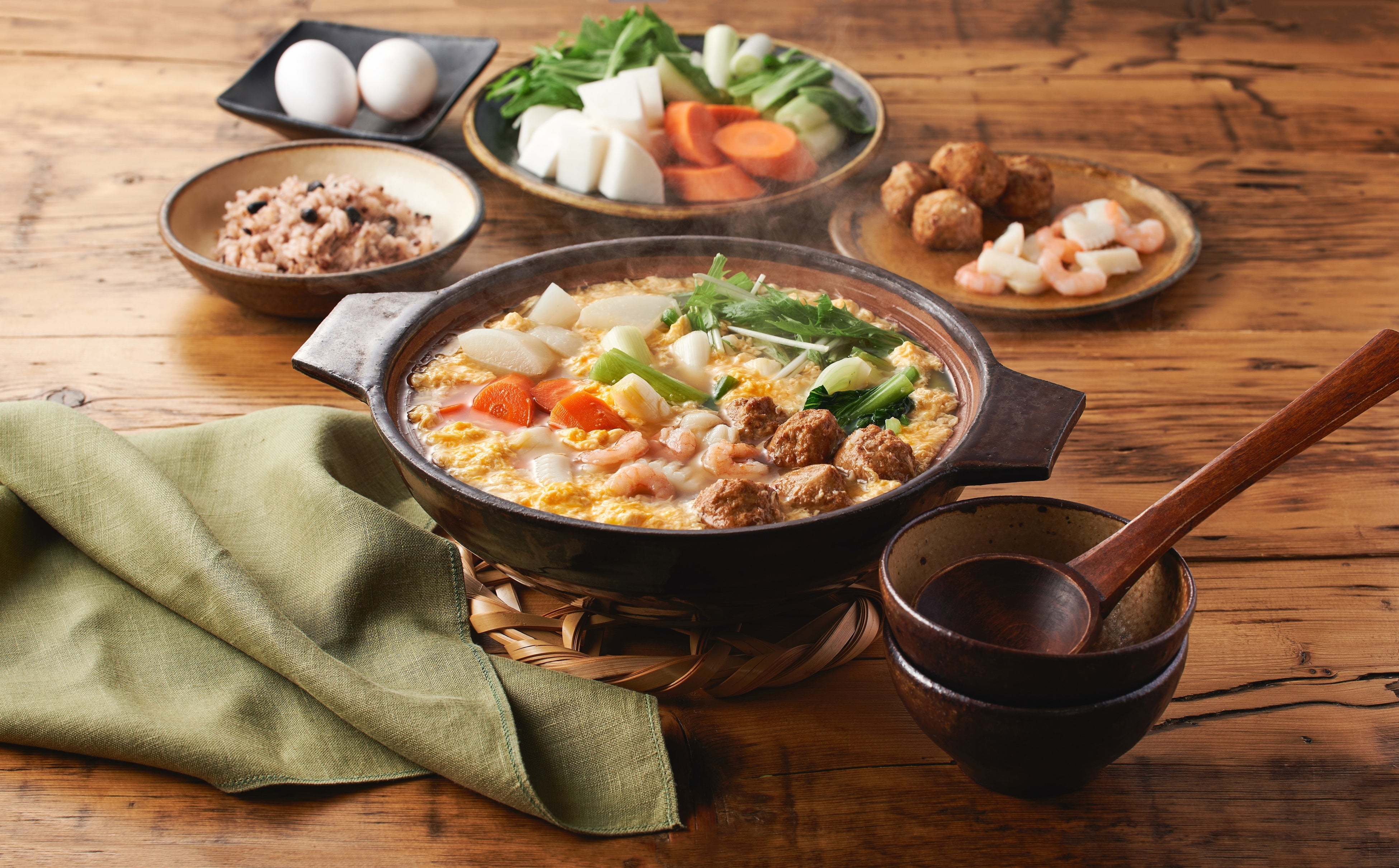 ●具材:卵、肉団子、海老、いか、大根、長ネギ、にんじん、チンゲンサイ、水菜