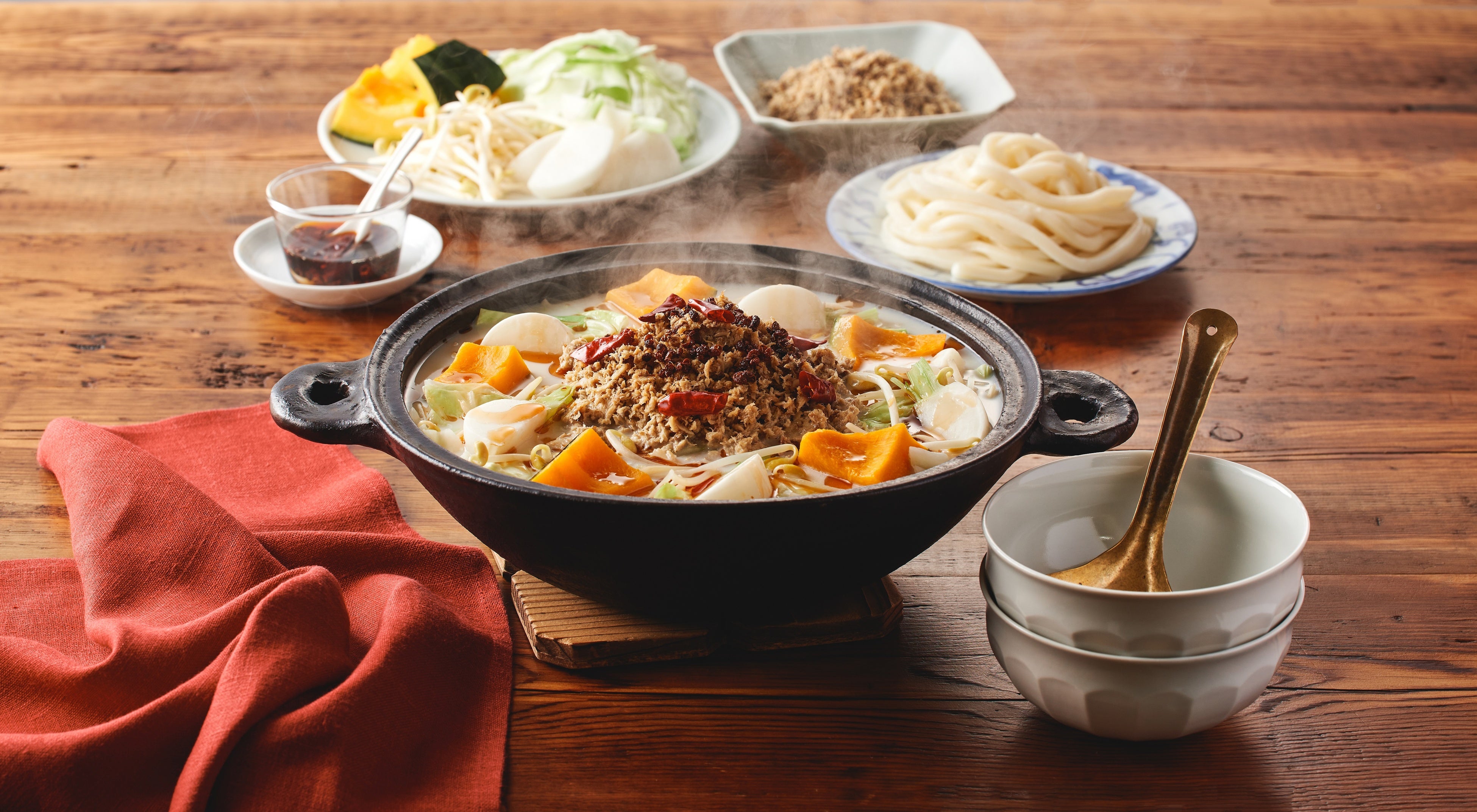 ●五感で楽しむポイント:花椒・唐辛子・ごま油を合わせて沸騰させた手作りラー油を仕上げに鍋に回しかけて、パチパチはじける音と広がる香りを楽しむ