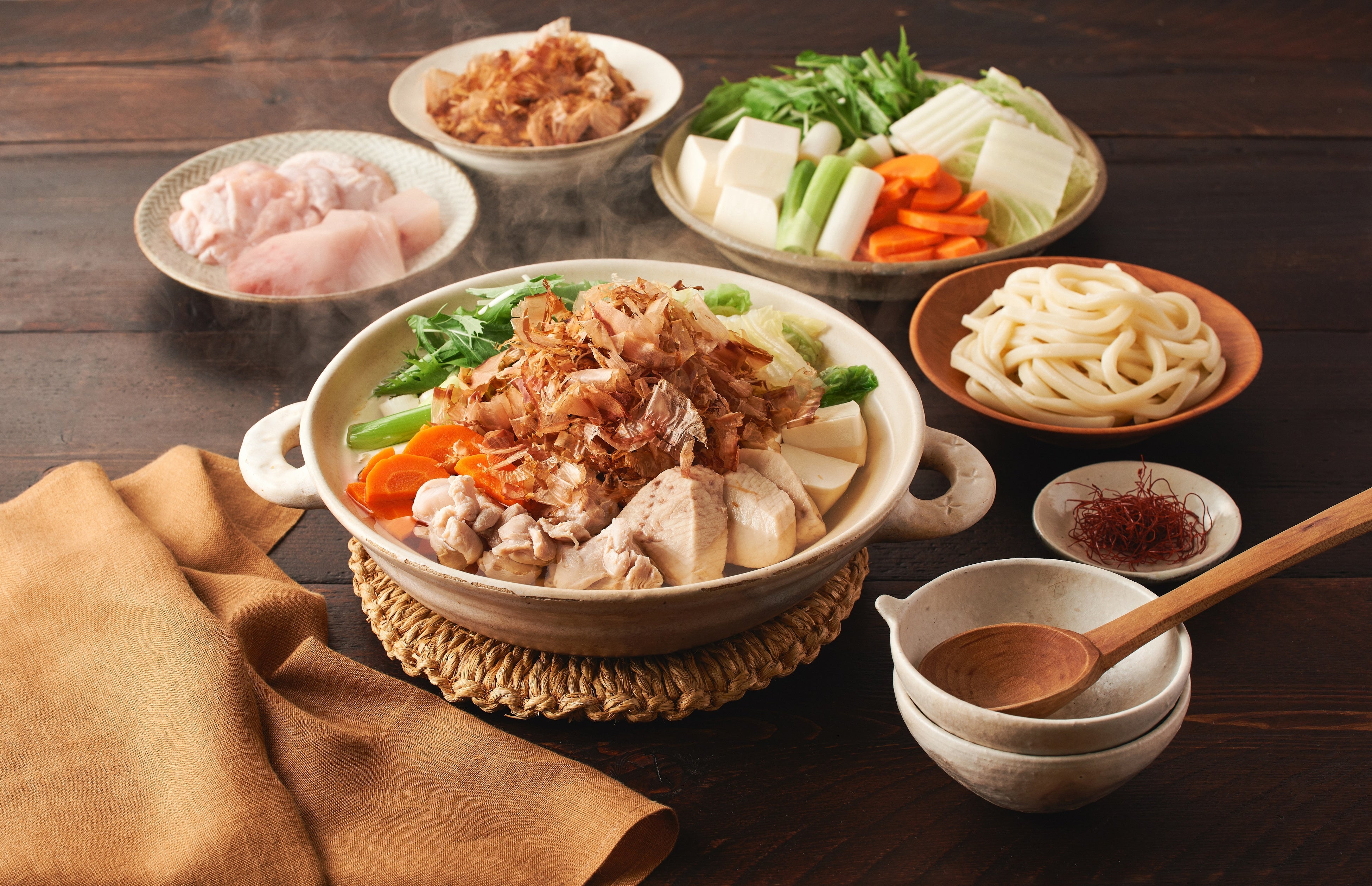 白だしの和風スープをベースにやわらかなチキンとボリュームのあるメカジキを入れた鍋で、鍋が完成したらたっぷりのかつお節を投入します。ゆらゆらと踊るけずり節と香りを楽しめます。