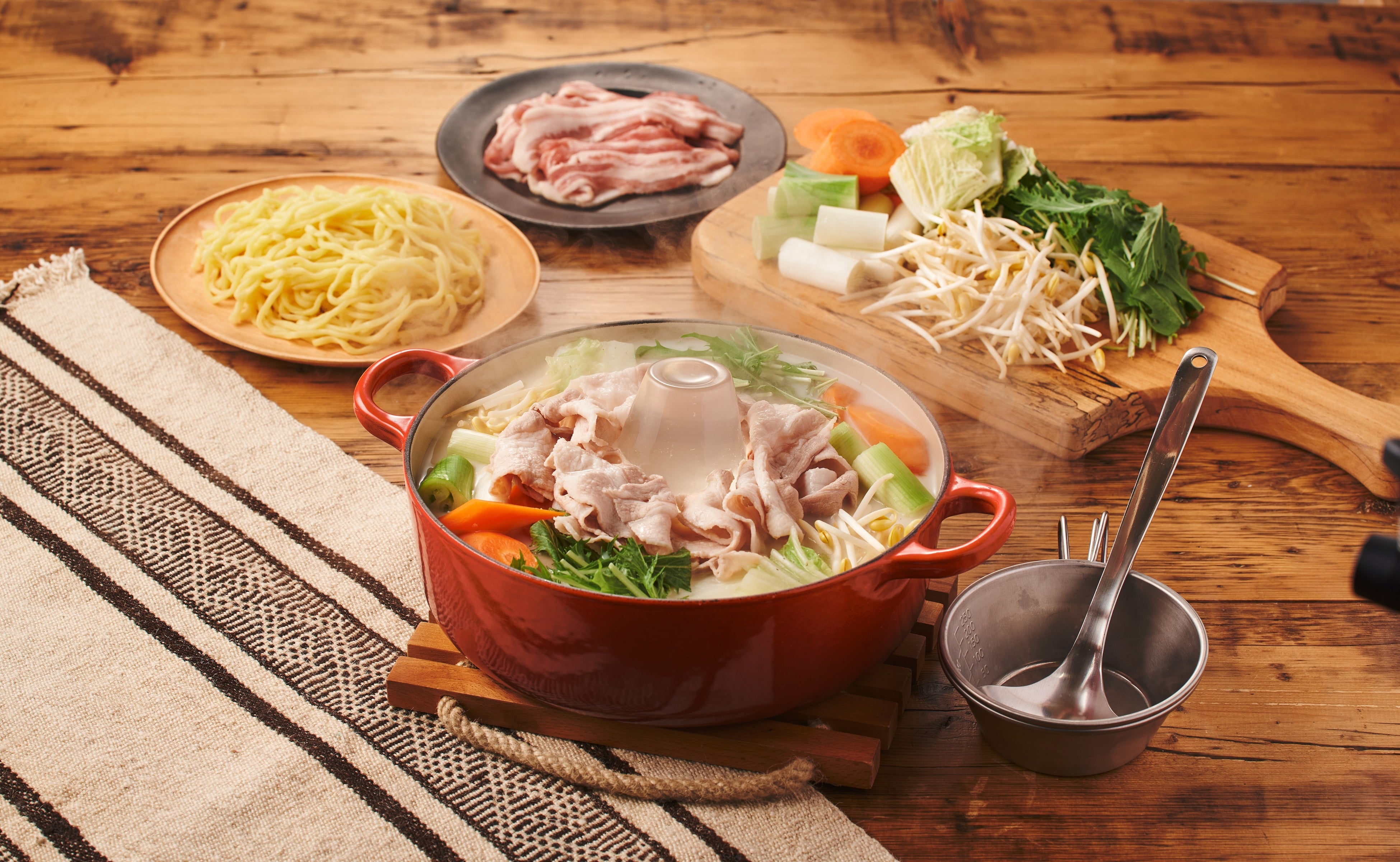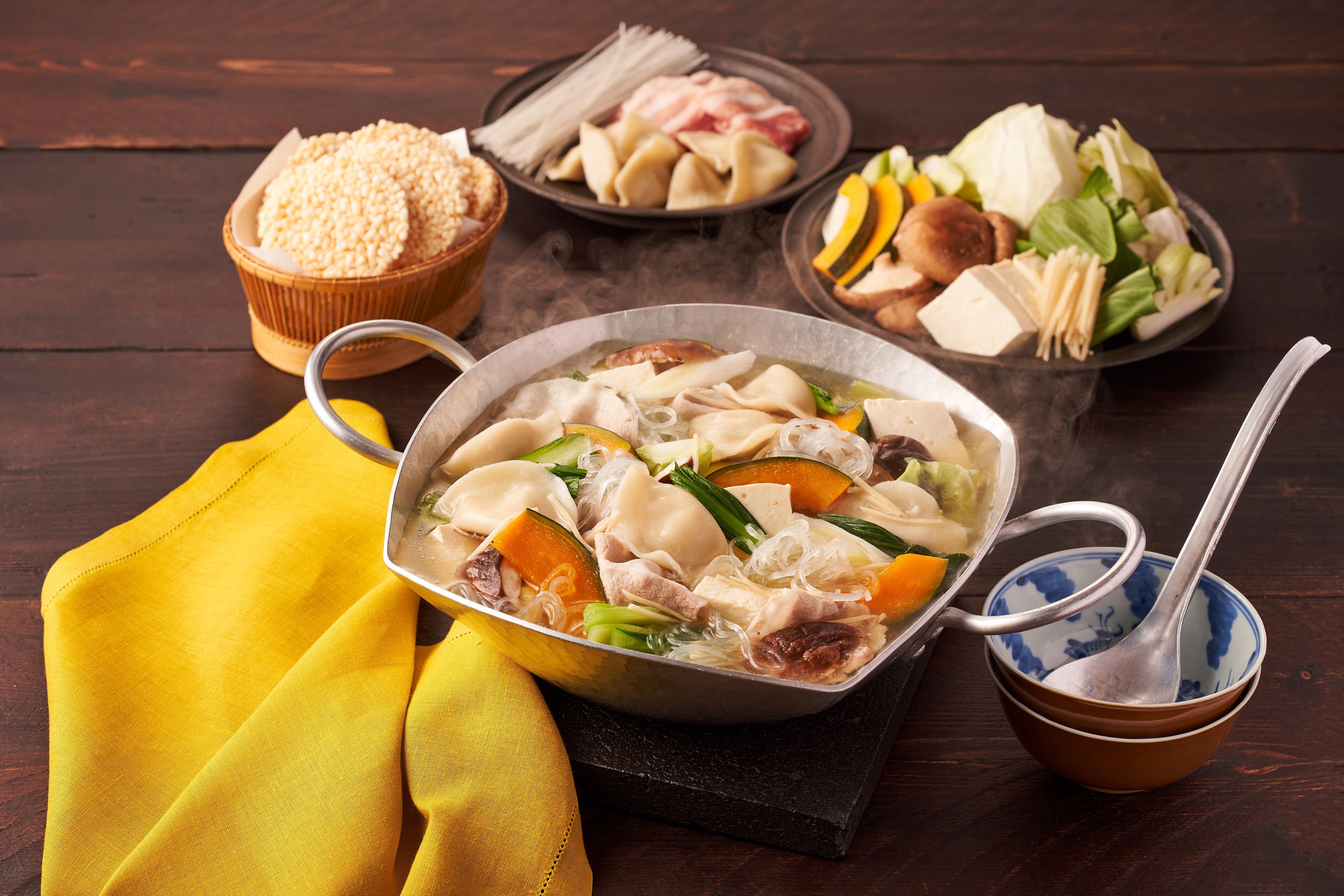●具材:水餃子、豚バラ肉、春雨、しいたけ、しょうが、かぼちゃ、長ネギ、チンゲンサイ、キャベツ