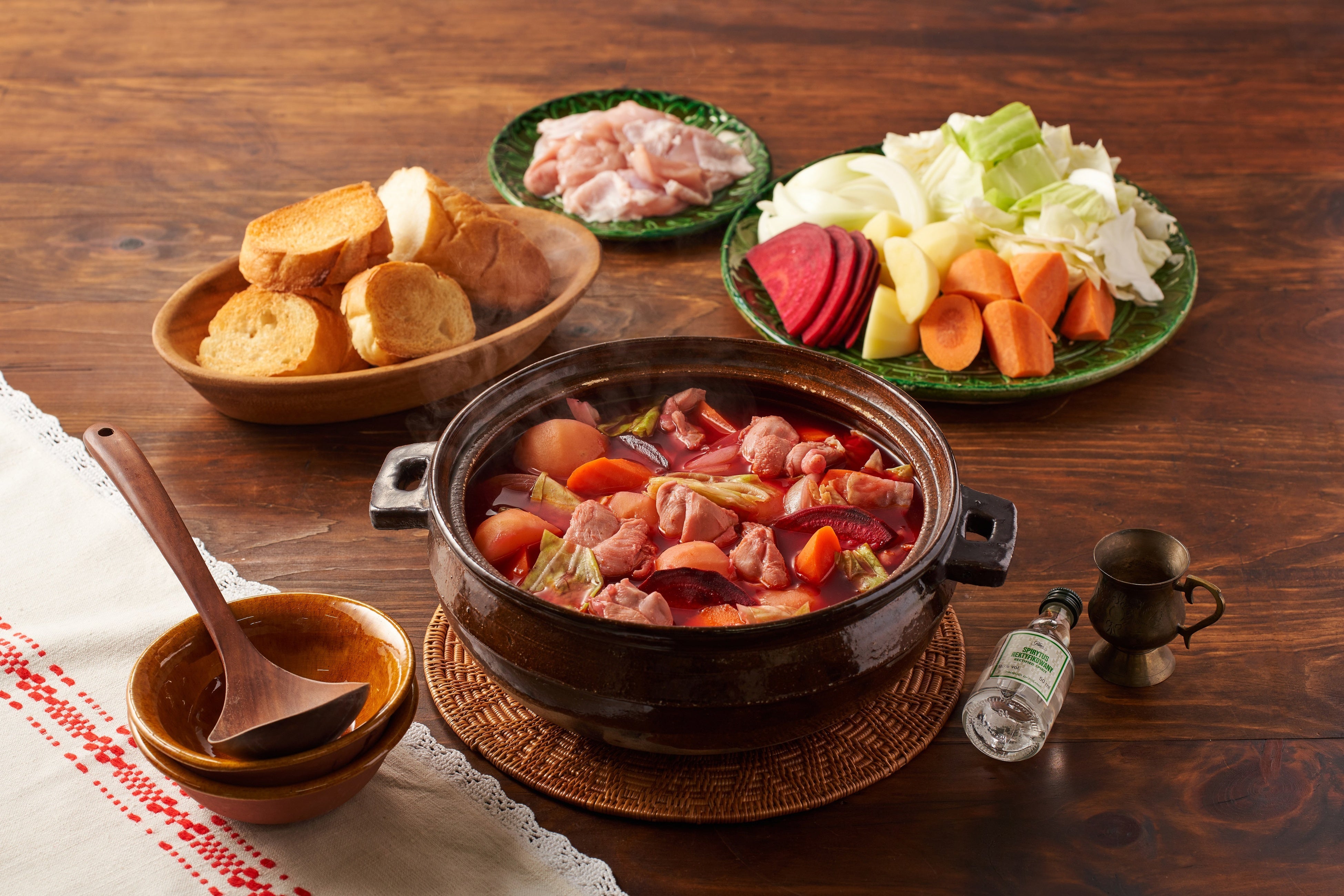 ウクライナ発祥の郷土料理「ボルシチ」を、農家さんが作るような野菜たっぷりの鍋にアレンジ。生のビーツを使用し、本格的ながら誰でも美味しく食べられる味わいに仕上げました。食べる直前にウォッカを流し入れ、フランベすれば完成です。