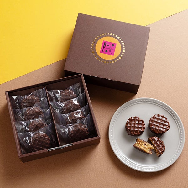 ワッフル型に焼き上げたクッキータイプの生地でなめらかな口どけのキャラメルをサンドして、全体をまるっとチョココーティング。