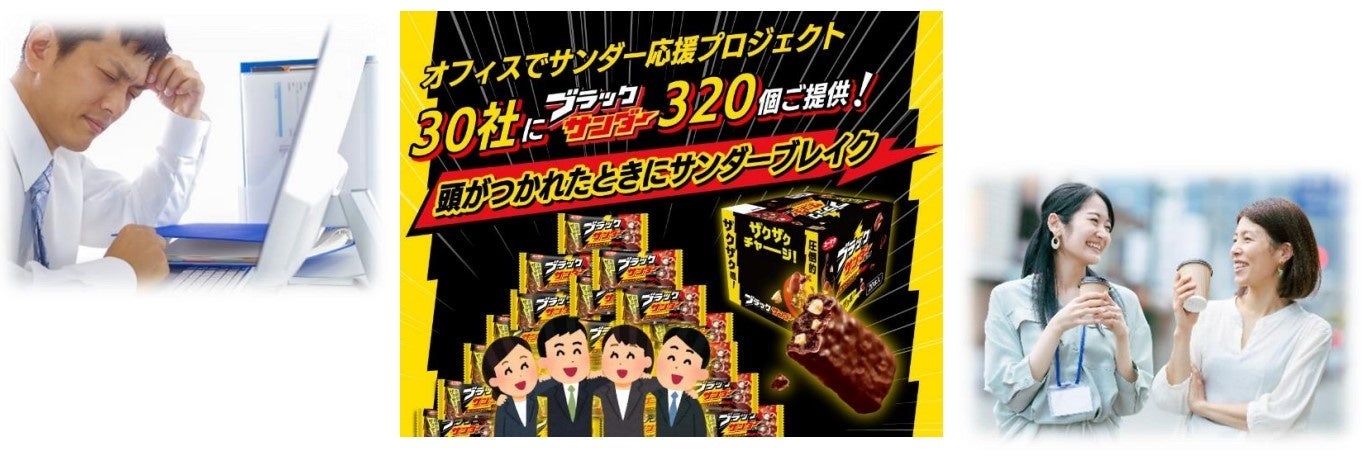 企画概要:仕事で頭がつかれたとき、ひと踏ん張り前などちょっと気持ちを上げたいときの休憩に、ブラックサンダーのザクザク感がぴったりです。一緒に働く同僚や上司のみなさまと一緒に食べたり、それぞれの働くスタイルに合わせてお楽しみいただけます。実際に仕事中の休憩にブラックサンダーを食べていただきたいと思い、職場にブラックサンダーを差し入れしてほしい企業(事業所)を募集しました。 ※現在は終了しております。
