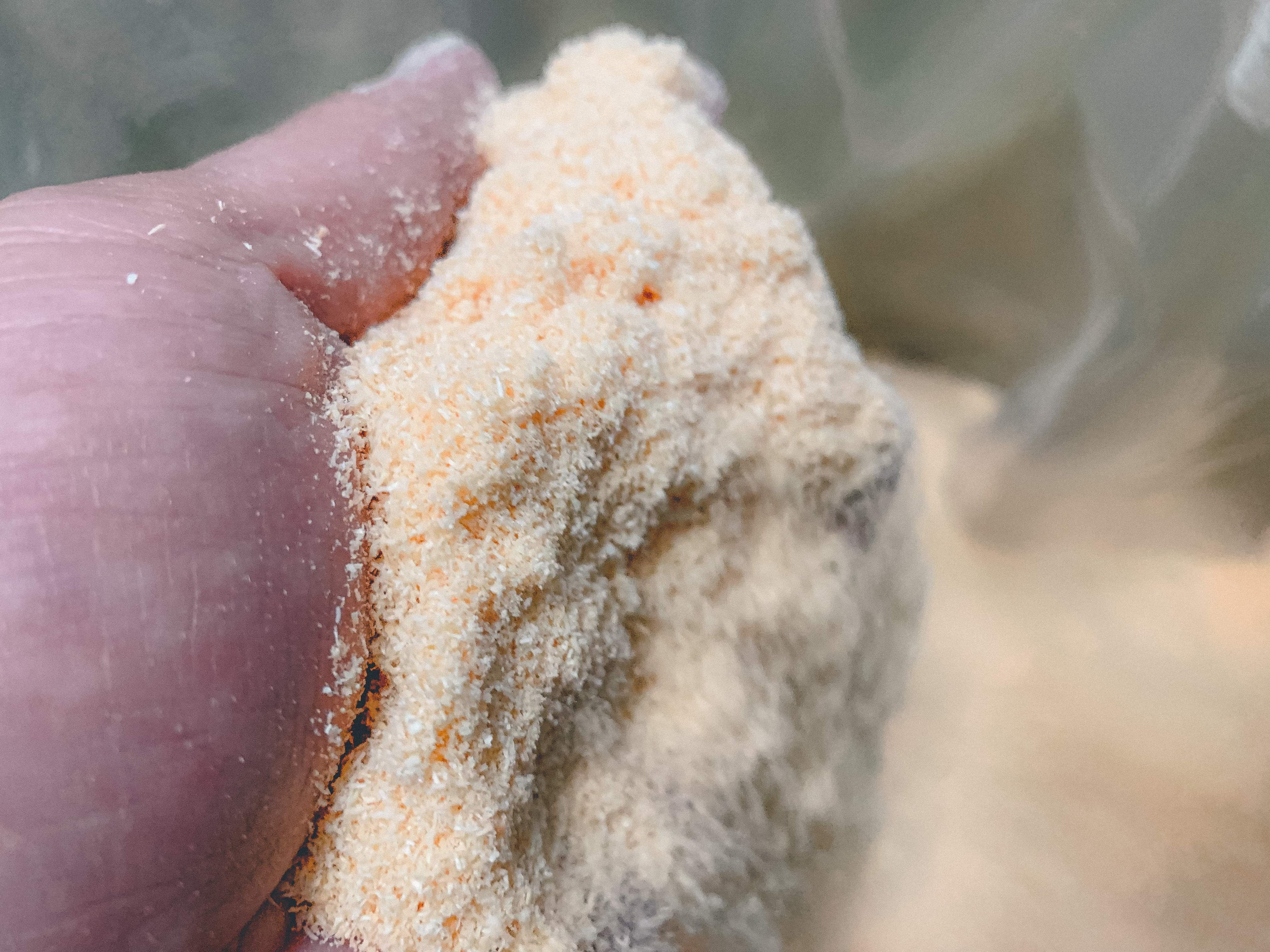 「えん発酵温熱木浴®︎」の素材はヒノキパウダーとヒノキ生葉と少量の米糠だ