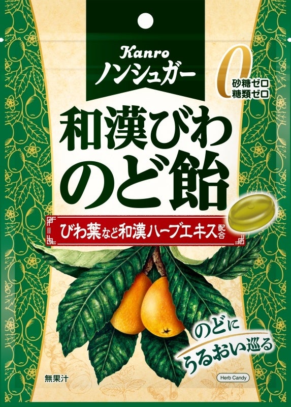 この度発売する「ノンシュガー和漢びわのど飴」は、東洋で昔からのどに良いといわれる「びわの葉」を中心に、古くから親しまれているヨモギや生姜、高麗人参、オオバコなどの厳選した和漢ハーブエキスに加え、プロポリスを配合。のどに優しく、うるおい巡るのど飴に仕上げました。デポジット製法によるなめらかな口当たりも、カンロのノンシュガーシリーズで特徴です。和漢ハーブの効能感を感じる、スッキリとした味わいをお楽しみいただけます。