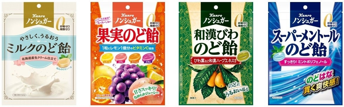 1992年の発売以来、長年多くのお客様にご愛顧いただいている「ノンシュガーのど飴シリーズ」は、4種のフルーツのジューシーなおいしさが楽しめる「ノンシュガー果実のど飴」、のどや鼻をすっきりさせたい時におすすめな「ノンシュガースーパーメントールのど飴」、後味のスッキリしたコクのあるミルクの味わいが楽しめる「ノンシュガーミルクのど飴」などシーンに合わせた多様な商品をご用意しております。