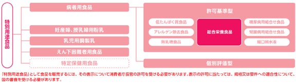 特別用途食品は病者用食品を始めとした下記の区分があり、表示許可を受けた食品は許可証票(マーク)をつけることができます。「総合栄養食品」は「病者用食品」のひとつです。「病者用食品」は、特定保健用食品(トクホ)や機能性表示食品を含む全ての食品制度において、唯一「病者に適する旨」の表示が許されています。