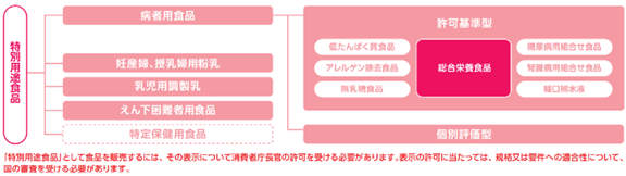 特別用途食品は病者用食品を始めとした下記の区分があり、表示許可を受けた食品は許可証票(マーク)をつけることができます。「総合栄養食品」は「病者用食品」のひとつです。「病者用食品」は、特定保健用食品(トクホ)や機能性表示食品を含む全ての食品制度において、唯一「病者に適する旨」の表示が許されています。