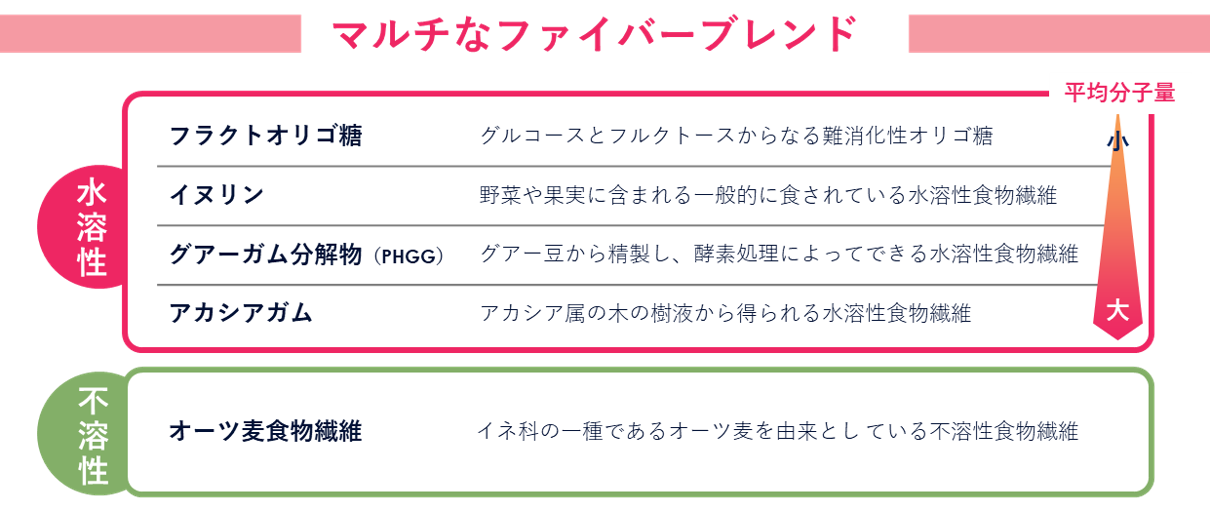 ネスレ ヘルスサイエンス独自のマルチなファイバーブレンドは、グアーガム分解物(PHGG)、アカシアガム、イヌリン、及びフラクトオリゴ糖、オーツ麦食物繊維を含みます。 分子量の多様性も考慮しています。