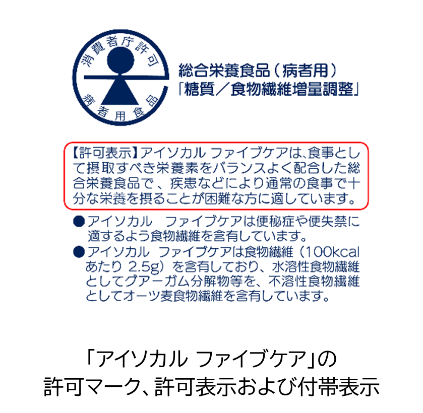 アイソカル ファイブケアは便秘症や便失禁に適するよう食物繊維を含有しています。アイソカル ファイブケアは食物繊維(100kcalあたり2.5g)を含有しており、水溶性食物繊維としてグアーガム分解物等を、不溶性食物繊維としてオーツ麦食物繊維を含有しています。 |