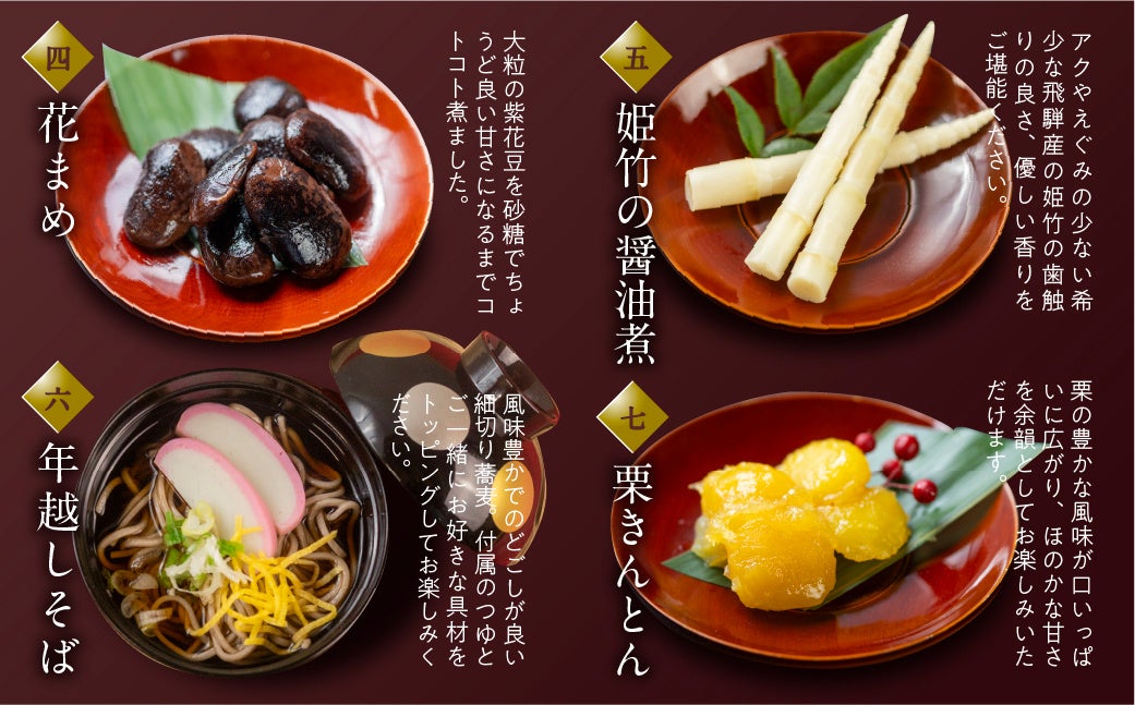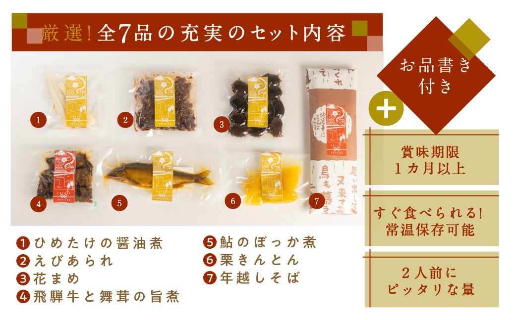 ①飛騨牛とマイタケの旨煮 ②鮎のぼっか煮 ③えびあられ ④花まめ ⑤ひめたけの醤油煮 ⑥年越しそば ⑦栗きんとん |