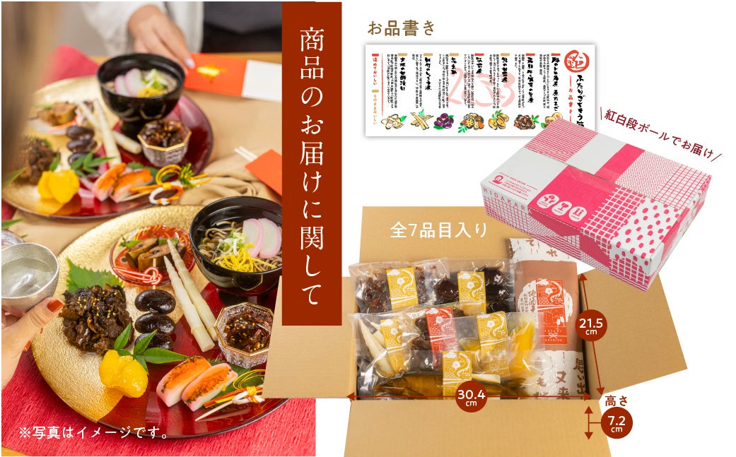 山々に囲まれ、自然豊かな飛騨だからこそ味わえる逸品ばかり。すべてパッケージに入った状態で発送するので、到着後にご自身にて盛り付けていただきます。お届けするすべてが常温保存可能なので冷蔵庫がいっぱいになりがちの年末年始に重宝します。
