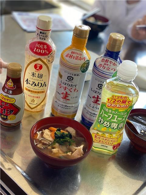 授業では、まず両社の社員が講師となり、鎌倉の郷土料理「けんちん汁」にも欠かせない、しょうゆと食用油のおいしさや健康性についてお伝えしました。続く調理実習では、鎌倉パークホテル「日本料理 和 みなもと」山口副料理長が講師を務め、プロ直伝のレシピでけんちん汁を作りました。子供たちは五感を駆使し、油で野菜を炒める際の香りの変化や、調味料による味と香りの変化、そして豆腐を手でちぎる感触を体験しました。特に、味見をしながら、しょうゆ、みりん、ごま油を入れる過程では、その変化に感嘆の声をあげながら、班ごとに相談して自分たち好みの味つけをしていました。