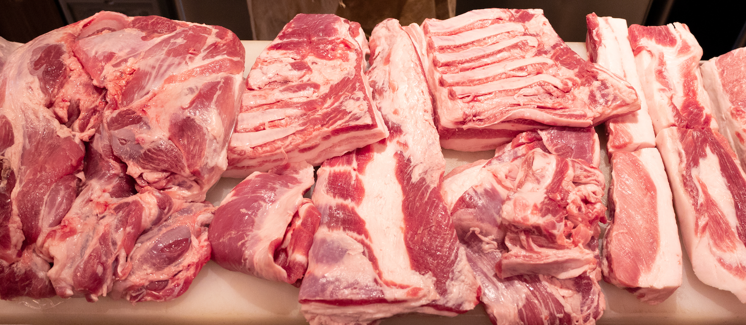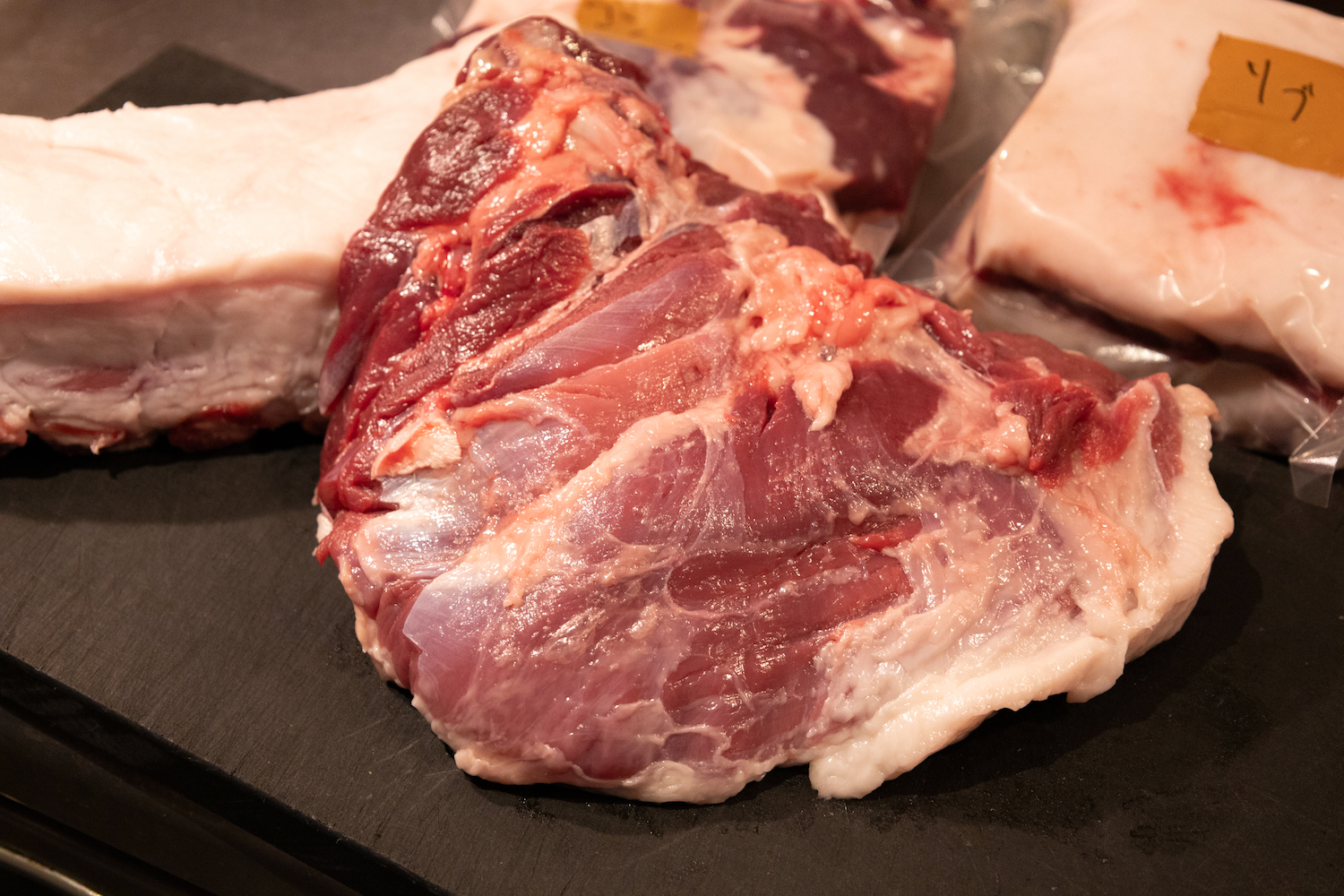 静岡県富士農場や日本各地の豚肉農家から半丸一頭(一頭の半分。全部位を含む形)で仕入れています。