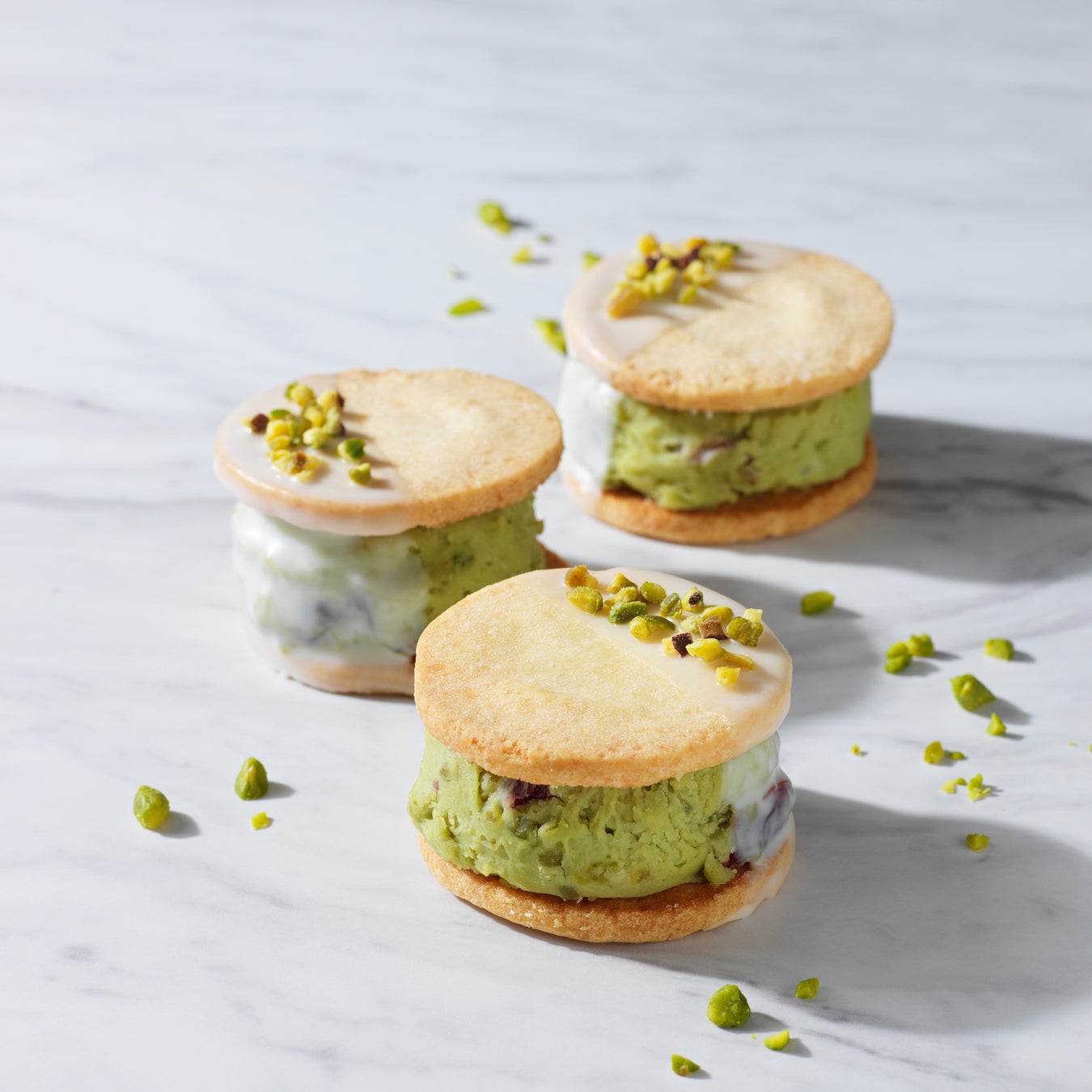 ピスタチオとチーズを合わせた濃厚なピスタチオクリームをチーズクッキーでサンドし、ホワイトチョコをかけました。