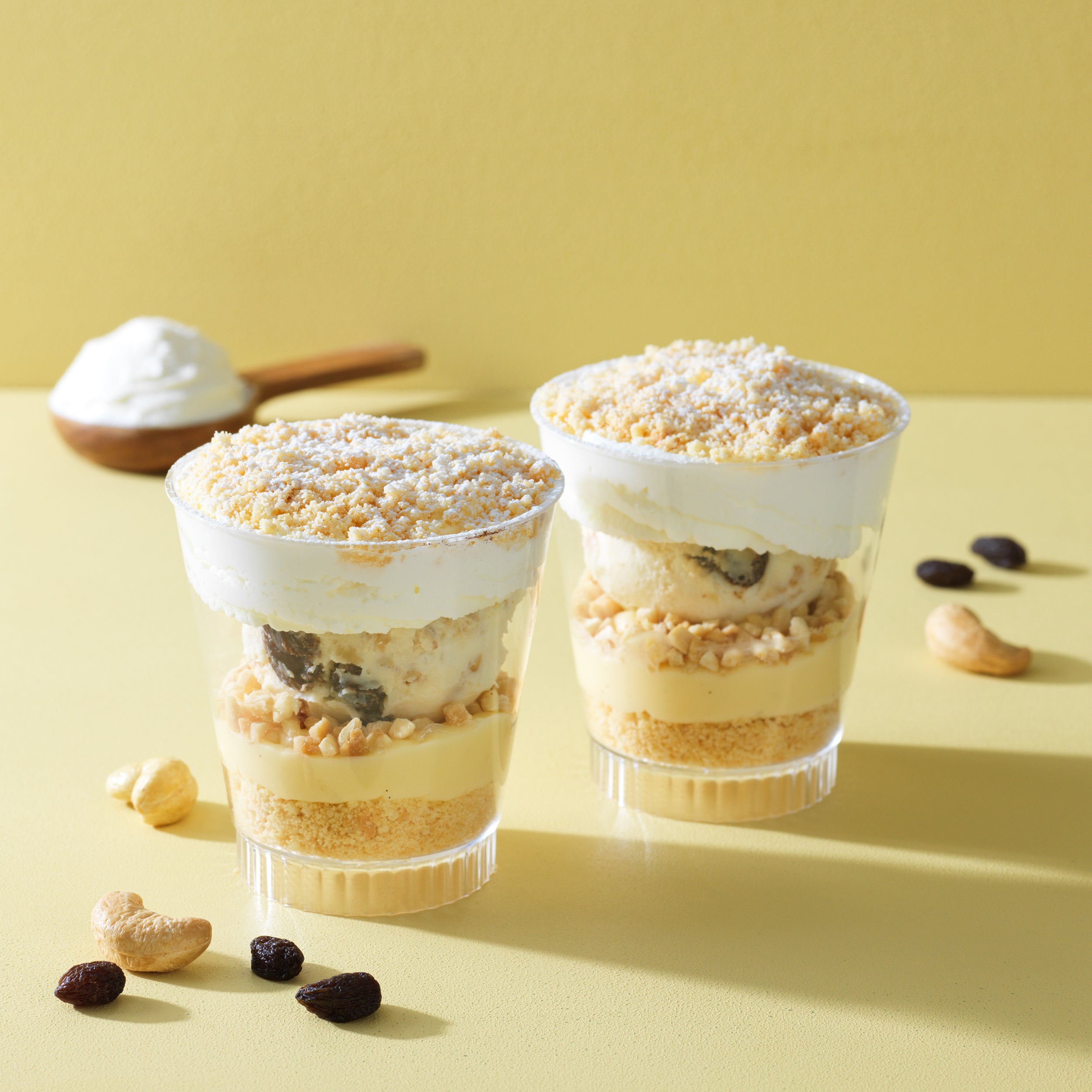 ナウオンチーズで人気のホロホロチーズクッキーにカスタードクリーム、カシューナッツ、レーズンとカシューナッツ入りの特製レアチーズクリーム、更に生クリームとチーズクッキーをまぶしました。さまざまな食感を楽しめるスイーツです。
