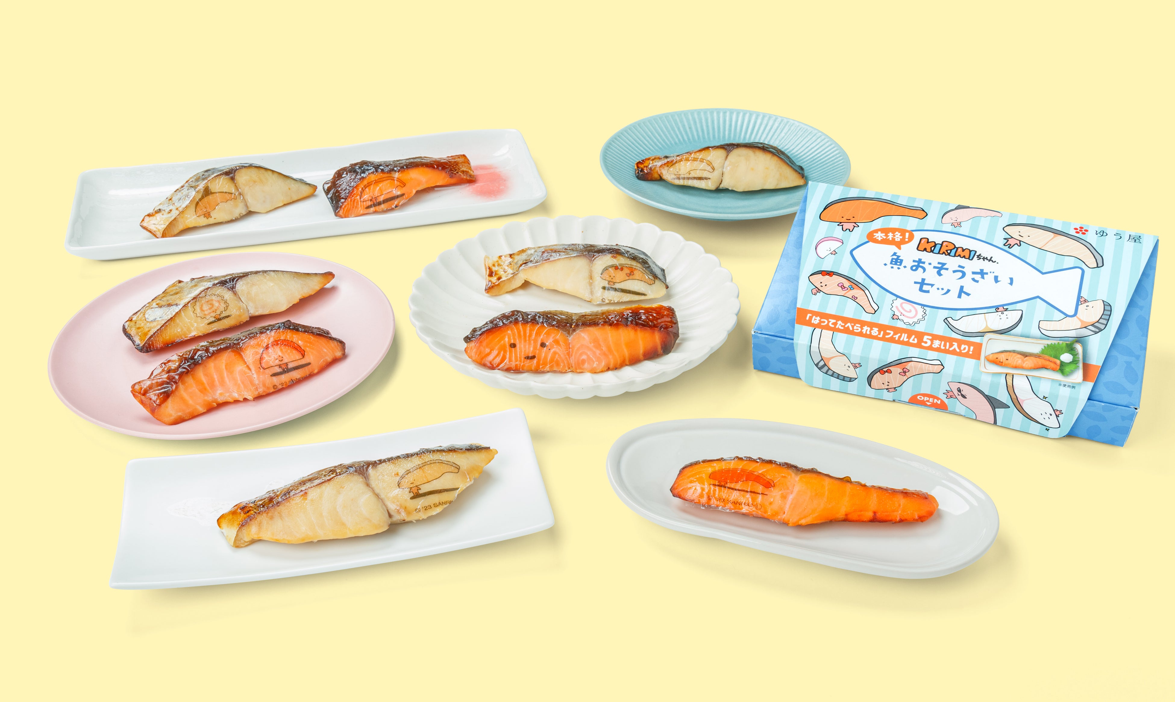 その想いから、食べ物に乗せるだけでいつもの食卓を彩り楽しめる、KIRIMIちゃん.がデザインされた「はってたべられる」フィルムと、ゆう屋の魚惣菜「西京焼」のセット商品が誕生いたしました。