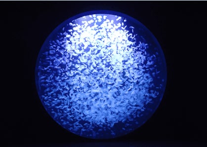 直径5 メートルの水槽「クラゲドリームシアター」には、約1万匹のミズクラゲを展示しており、全て当館で繁殖して育てています。