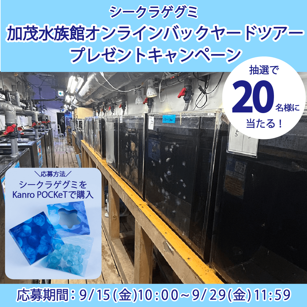 今回は、加茂水族館の裏側がお楽しみいただけるオンラインバックヤードツアーの参加権利が当たるキャンペーンを開始します。クラゲ好きにはたまらない内容となっておりますので、この機会に「シークラゲグミ」をぜひお試しください。