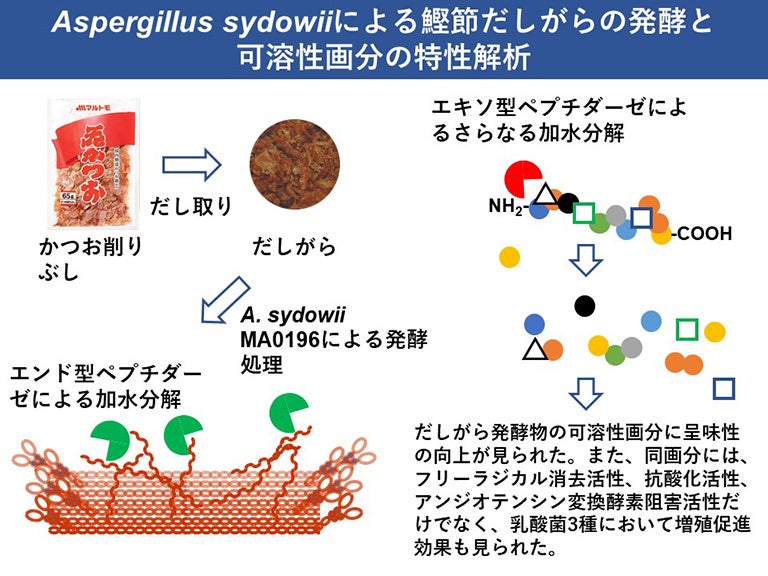 本研究では、「めんつゆ」や「だし」の製造工程で発生する食品残渣「だしがら」をかつお節かびで発酵させ加水分解することにより、だしがら発酵物の可用性画分に呈味性の向上が確認できました。また、同画分には、フリーラジカル消去活性、抗酸化活性、アンジオテンシン変換酵素阻害活性だけでなく、乳酸菌の増殖促進効果も見られました。この成果はSDGsの観点から有用であり、今後の調味料開発への発展が期待できます。
