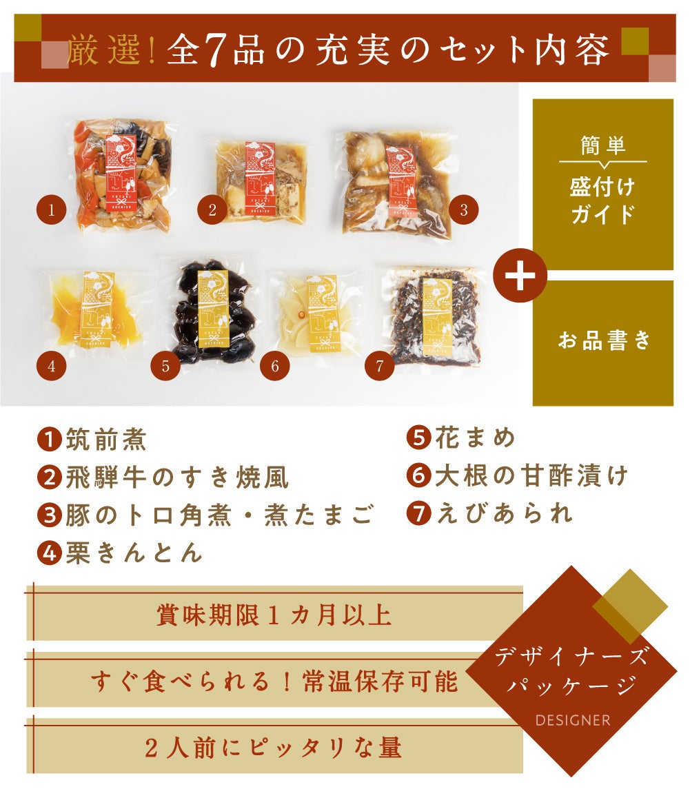 最近では30品を超える豪華なおせちも増えてきました。しかし、「おせち以外も楽しみたい」「嫌いなものもある」「予算を抑えたい」という声を受けてあえて品数を絞っております。2~3人で楽しめる適度な量です。4社のメーカーと協力し、極力添加物を控え、やさしい味付けにしております。