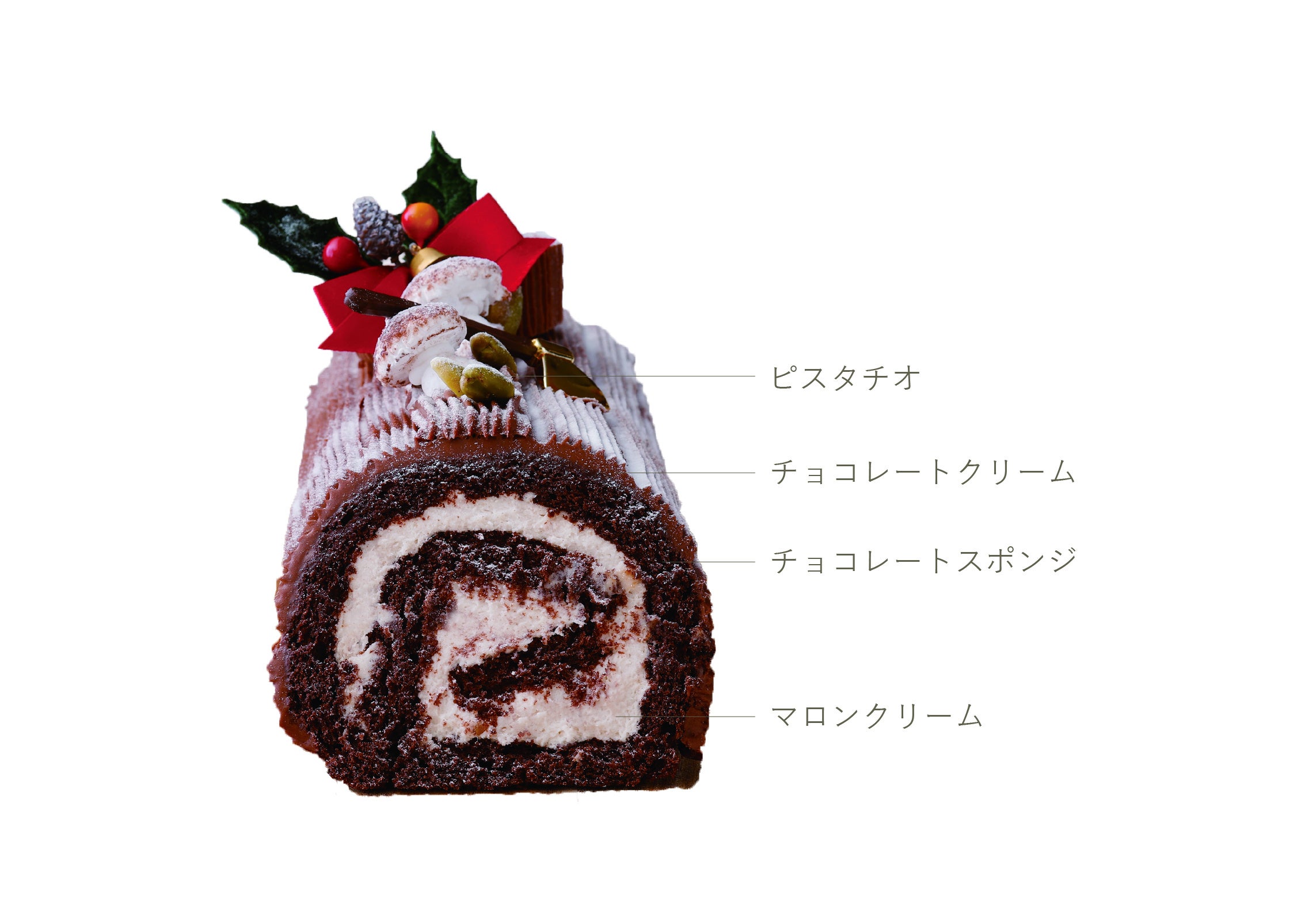 ふわふわのチョコレートスポンジに、カットした栗がアクセントの風味豊かなマロンクリームをたっぷりとサンドしました。まろやかなチョコレートクリームで切り株風にデコレーションしたクリスマスならではのケーキです。