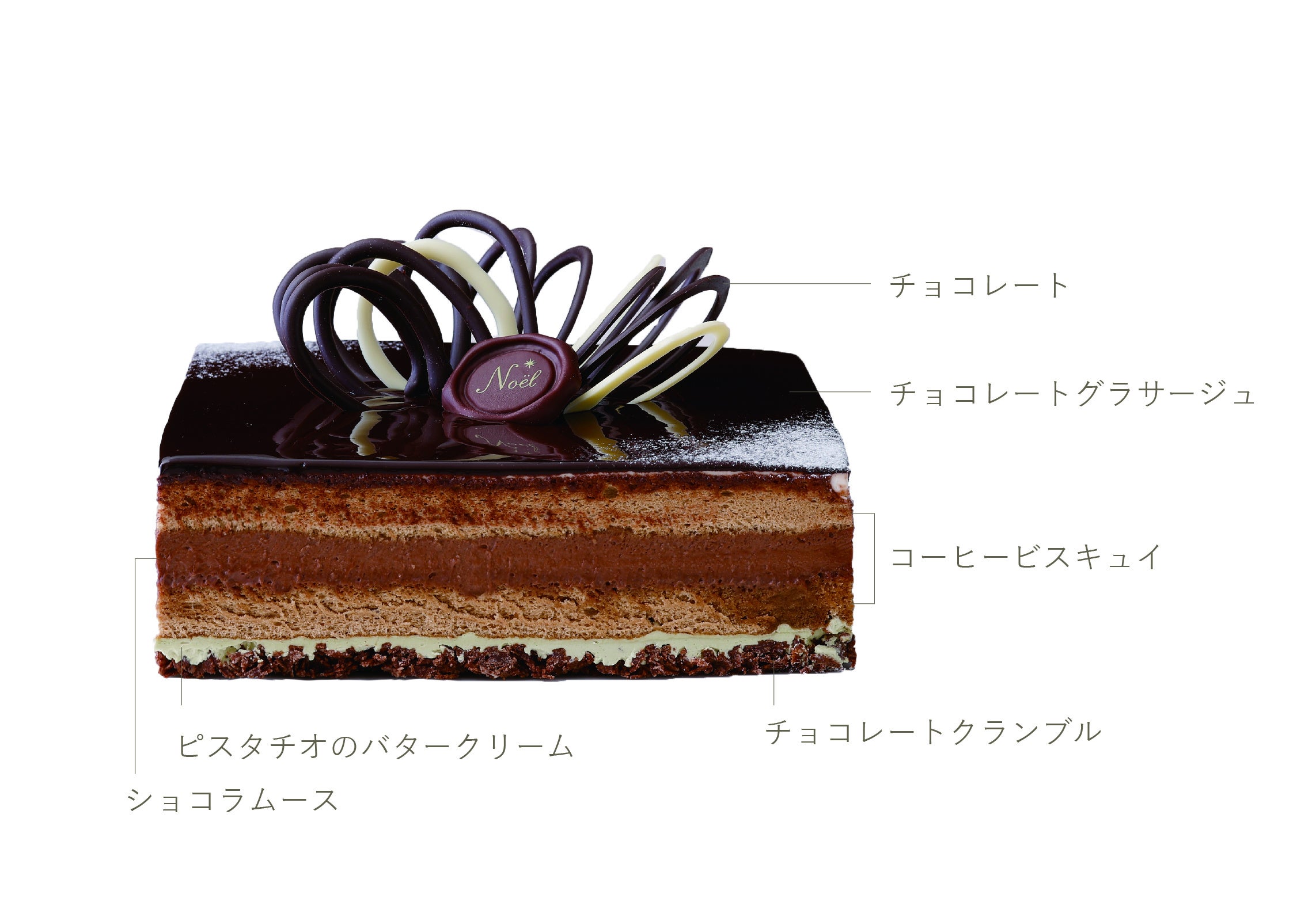 ショコラムースをコーヒーとブランデーのシロップがしみ込んだビスキュイでサンドしました。濃厚ながらコーヒーの風味が後引くすっきりとした大人の味わいです。艶やかなチョコレートコーティングの上に美しく弧を描くチョコレート細工が、凛とした雰囲気の一品です。
