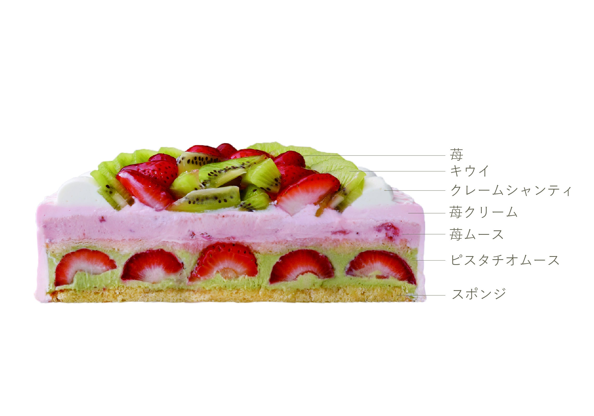 苺とピスタチオのムースにフレッシュないちごをたっぷりとサンド。淡いピンク色のいちご風味の生クリームで全体を覆い、トップには艶やかな苺とキウイをふんだんに飾りました。可憐なレース模様のような繊細な装飾も美しく、パーティーの主役にぴったりの華やかなケーキです。