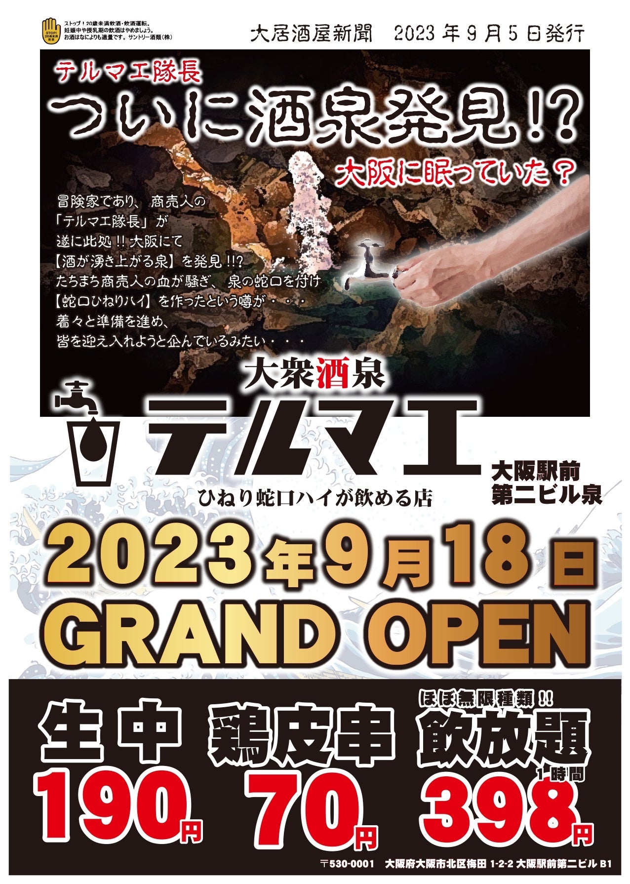 株式会社BIRCH(東京都渋谷区)は2023年9月18日に関西初出店となる大阪府梅田の大阪駅前第二ビルに【ひねり蛇口ハイ大衆酒泉テルマエ大阪駅前第二ビル泉】をオープンする。