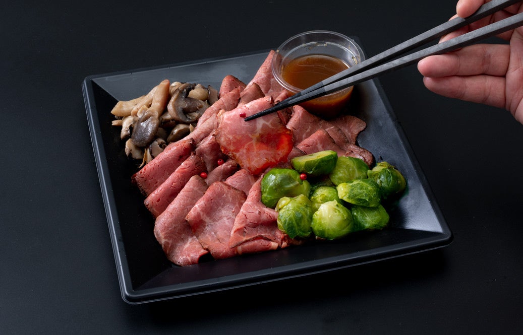 しっとりやわらかく仕上げた牛もも肉のローストビーフに付け合わせで芽キャベツのローストときのこミックスを合わせました。まろやかですっきりとした味わいのホースラディッシュ風味のソースをかけてお召し上がりください。