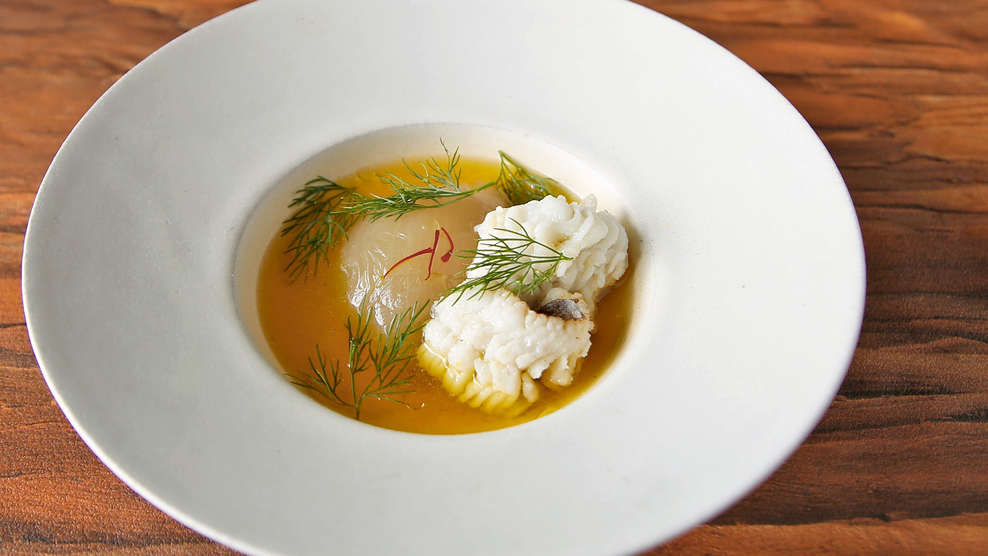 炭で軽く炙った鰆を、季節の梨と塩レモンの味わい深いサラダとご一緒に。