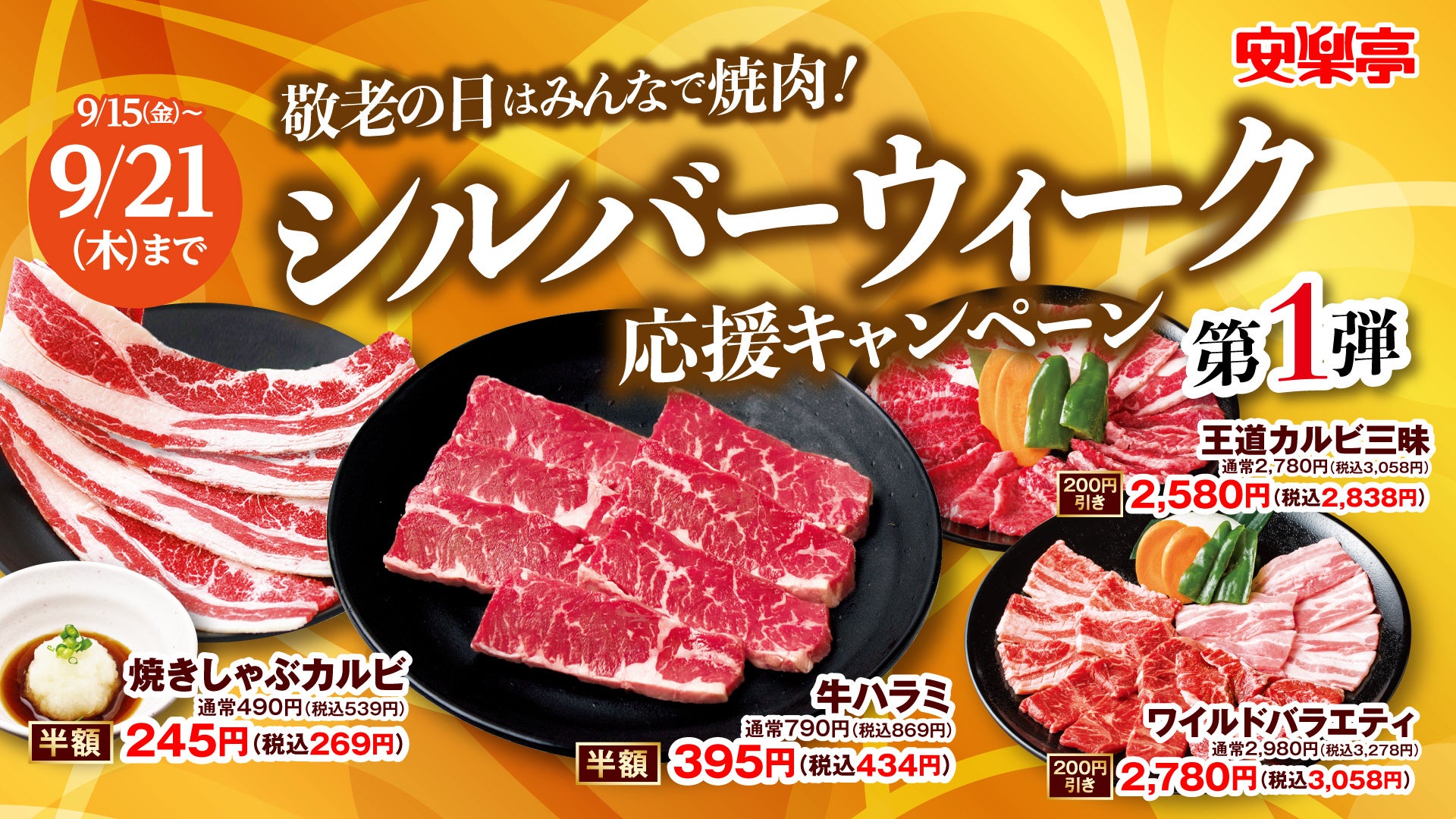焼肉レストラン安楽亭(本社:埼玉県さいたま市、代表取締役社長:柳 先 以下「当社」)は、9月のシルバーウィークに合わせて、「シルバーウィーク応援キャンペーン第一弾」として、分厚い食べごたえと溢れる旨みが人気の「牛ハラミ」が半額、テーブルを彩る迫力の焼肉大皿が200円引きになるキャンペーンを、9月15日(金)より安楽亭店舗にて実施いたします。