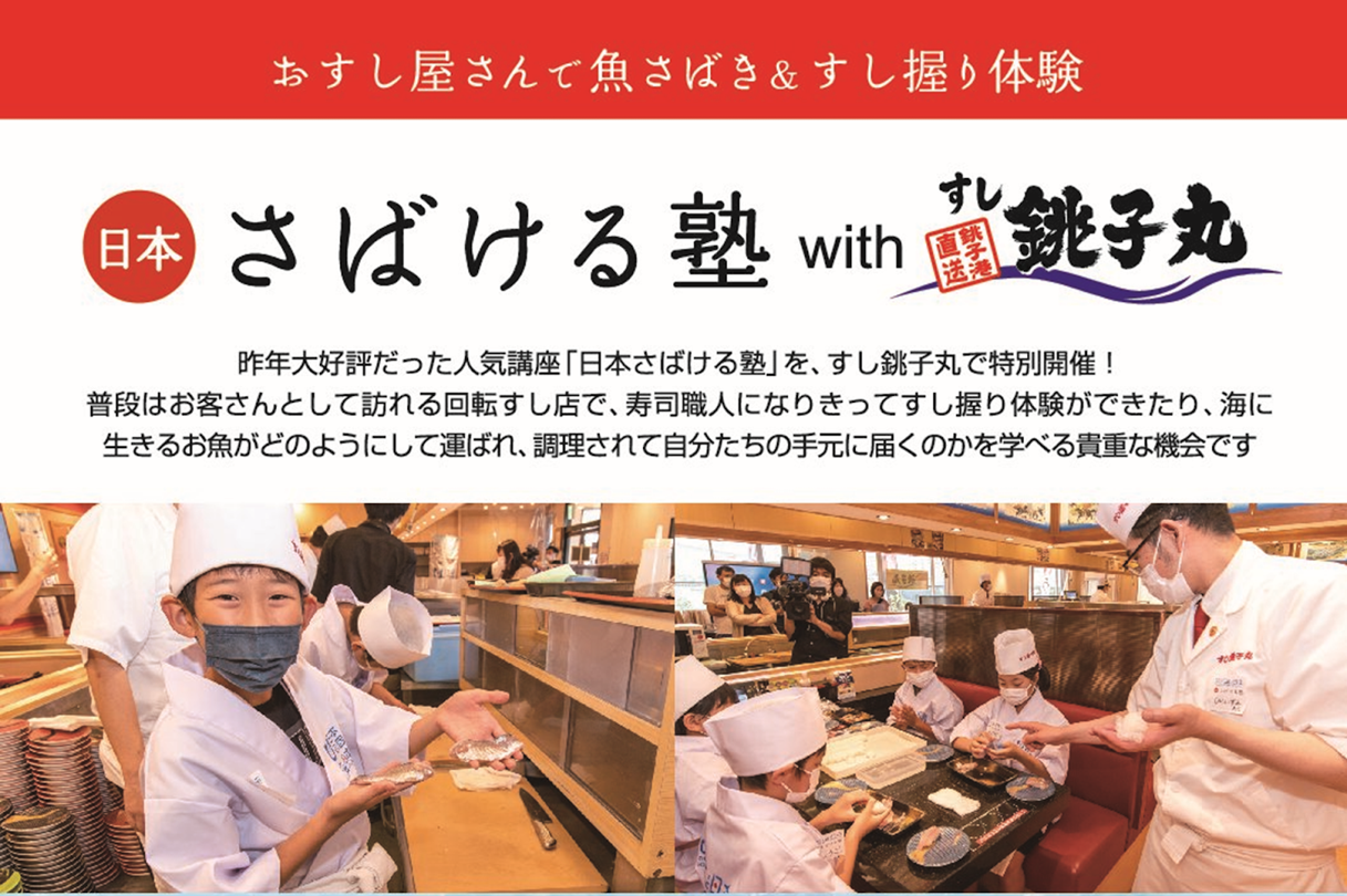 「すし銚子丸 高洲店」での日本さばける塾では、寿司職人の指導のもと、三枚おろしの基本となるアジを一人一尾さばき、握り寿司に挑戦するほか、東京湾で獲れた魚介類も調理します。千葉県が面する東京湾の特徴や変化を学び、地元の海に生きる魚や貝、海藻のメニューをおすすめするPOPも制作。最後にはアジの握り、東京湾産の海産物を使ったメニューを回転ずしレーンに流して、親子でおいしく頂きます。イベントを通して身近な海を知り、すぐに伝えることで参加者の海への興味関心を深める取り組みになる予定です。