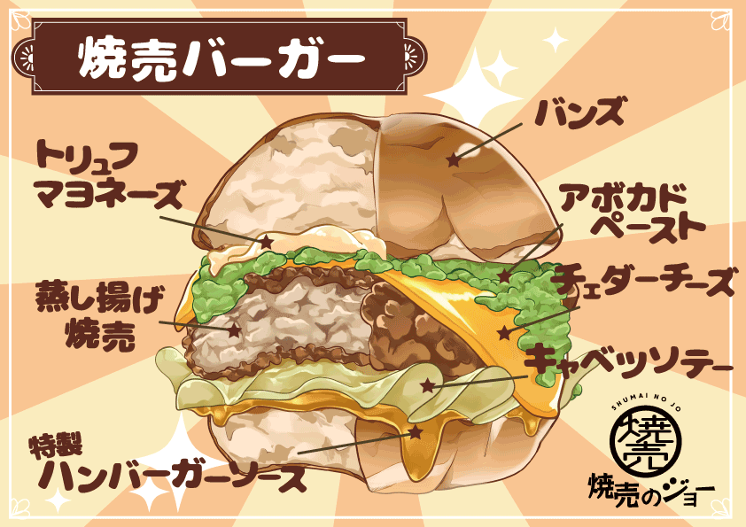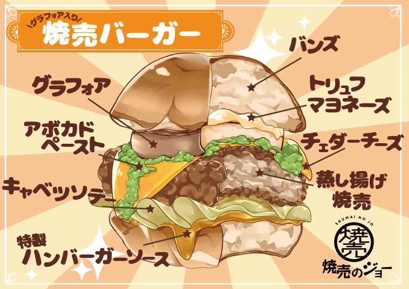 焼売を新しい形で食べてもらいたい。さらに“ハンバーガー”という違った形でも焼売を楽しんでもらい焼売を広めていきたいという思いで今回は焼売バーガーを作りました。今回『焼売バーガー』『グラフォア入り焼売バーガー』の販売店舗は直営店だけではなく、ライセンス店でも販売を行うため、全店舗の焼売のジョーで楽しめる形となっております。多様な面からこだわった焼売バーガーとなっております。