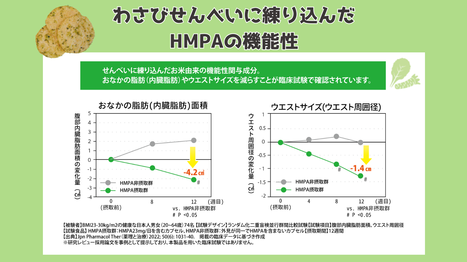 ③食後血糖値が高めの方の食後に上昇した血糖値を下げる、お米由来のポリフェノールである機能性関与成分:3-(4-ヒドロキシ-3-メトキシフェニル)プロピオン酸(HMPA)を配合した、3つのヘルスクレームをもった日本初(※2)のおせんべいです。