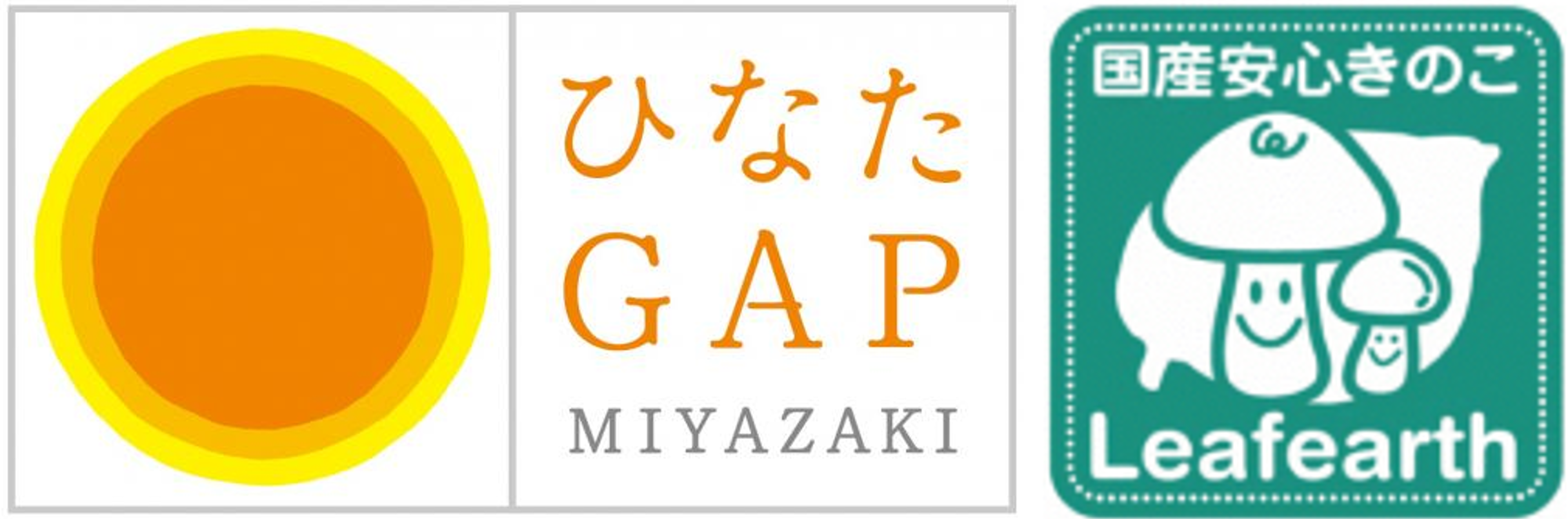 宮崎県版「ひなたGAP」の認証を取得。GAPに基づく徹底した生産管理で、季節に関わらず年中安定した高品質のしいたけを生産・出荷します。また、「国産安心きのこ認証」を保有。きのこ栽培の培地である菌床の原料、及び原木の安全性にこだわり、農薬に頼らずに国内で栽培されたきのことして認証されています。