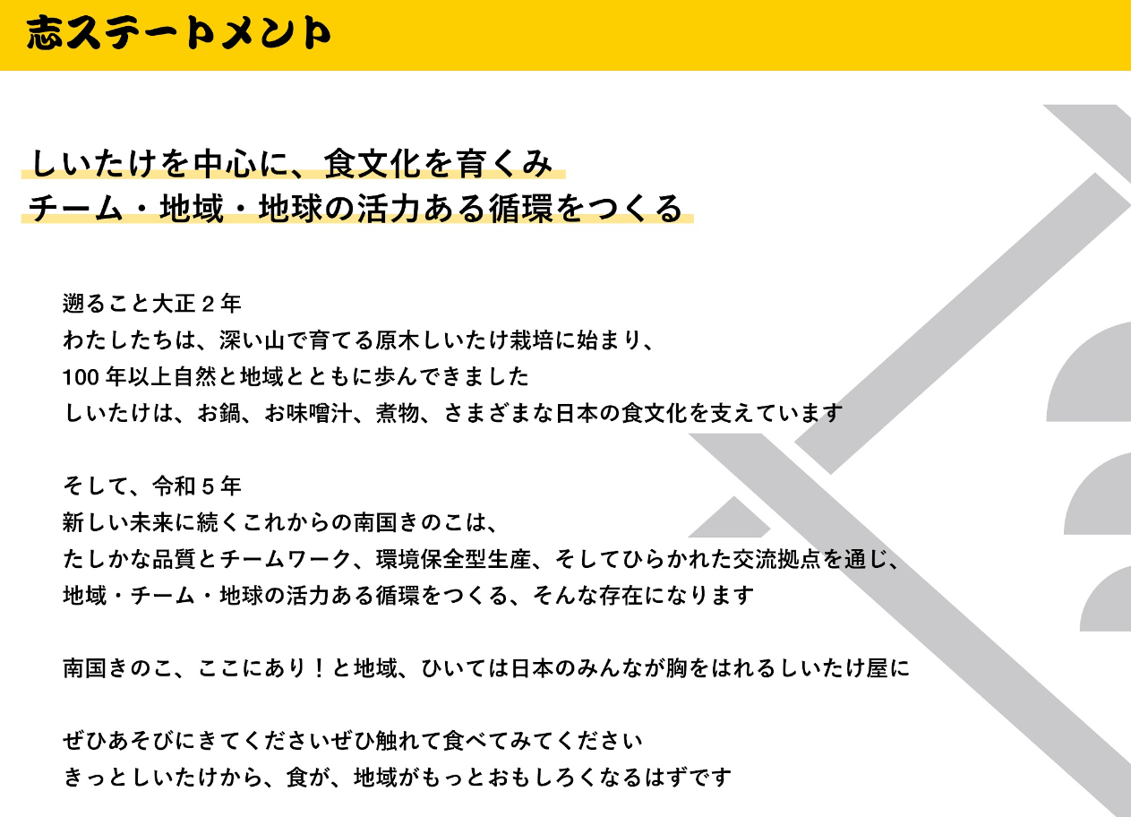 南国きのこは、「しいたけを中心に食文化をはぐくむみ、チーム、地域、そして地球の活力ある循環をつくる」この志を新たに掲げました。地域の方をはじめ若い世代の方々にも親しんでいただける機会を自ら作り、地域の発展にも貢献してまいります。