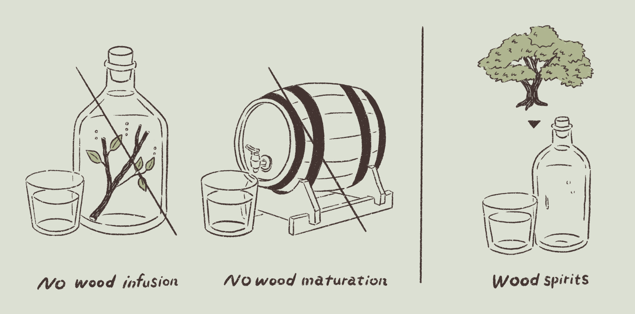 「木の酒」というと、これまで、木の樽で熟成したお酒や、木のオイルを注入したお酒が “木の酒” と呼ばれることがありましたが、私たちは木材を粉砕し、木そのものを発酵・蒸留させることで、世界初のまったく新しいお酒を生み出しています。