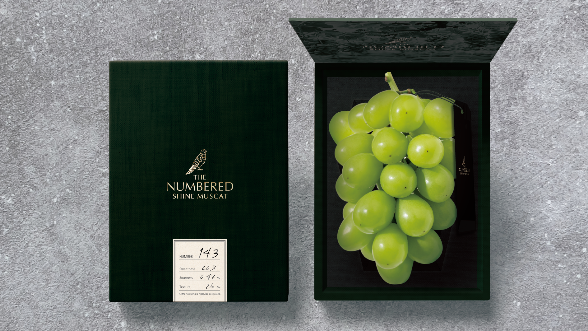 一つひとつ丁寧に栽培し、数万房の中から厳選された上位「1%のみ」を採用したザ・ナンバード。「番号付けされた一房」を意味する名前が命名され、選び抜かれた一房であるシャインマスカットとしてナンバリングと20%以上の糖度、酸度とテクスチャーの数値もパッケージに記載され、確実な美味しさであることを証明。