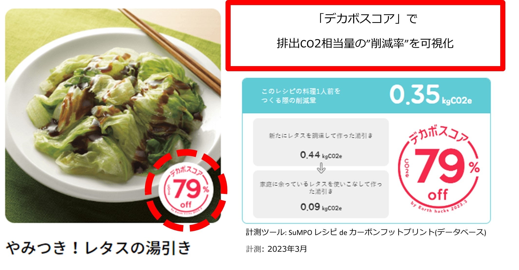 (注4)味の素株式会社は、脱炭素に関心がある方向けに、自分の生活にも取り入れたいと思えるライフスタイルやエシカルな商品の情報を提供する共創型プラットフォーム「Earth hacks」に2022年7月より参画しています。「Earth hacks」では、参画パートナー企業が展開する商品やサービスの排出CO2相当量の“削減率”を「デカボスコア」として可視化しています。「Earth hacks」については、https://earth-hacks.jp/ をご確認ください。「デカボスコア」については、「Earth hacks」のウェブページをご確認ください。https://decarbo.earth-hacks.jp/about/