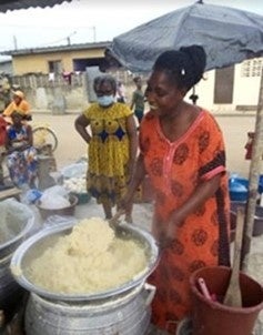 2つ⽬は、社会進出を希望する⼥性の就労のサポートです。⻄アフリカのカカオの⽣産⼯程では、⽂化的な背景から、⼥性が農園主である男性のサポート役とされる場合が多く、経済的に⾃⽴する機会が限られている現状があります。社会で活躍する機会を得たい、経済的に⾃⽴したい・家族をサポートしたいと願うカカオ農園の⼥性たちがいきいきと活躍する機 会の創出をサポートしています。具体的には、キャッサバの栽培と販売による収⼊の獲得をサポート。キャッサバはタピオカの原料である芋の⼀種で、ガーナの主⾷の1つでもあり、⽣産量は世界第 4 位を誇ります(2019 年)。キャッサバの種⼦を提供するだけでなく、栽培に関する農学トレーニングを実施することで効率的に栽培する⽅法を学ぶ機会を提供。更に、粒上にしてもち⽶の様にしたアチェケや、粗挽きの粉にして⾷べるガリなど、現地で⾷べやすいように加⼯し、付加価値を付けて販売できるような加⼯器具を提供する活動も⾏うことで、安定して収⼊を得ることに繋がる応援しています。