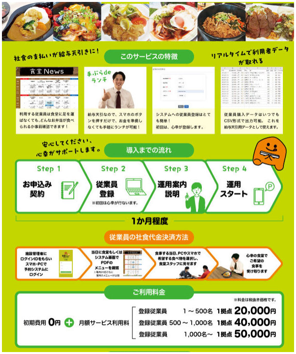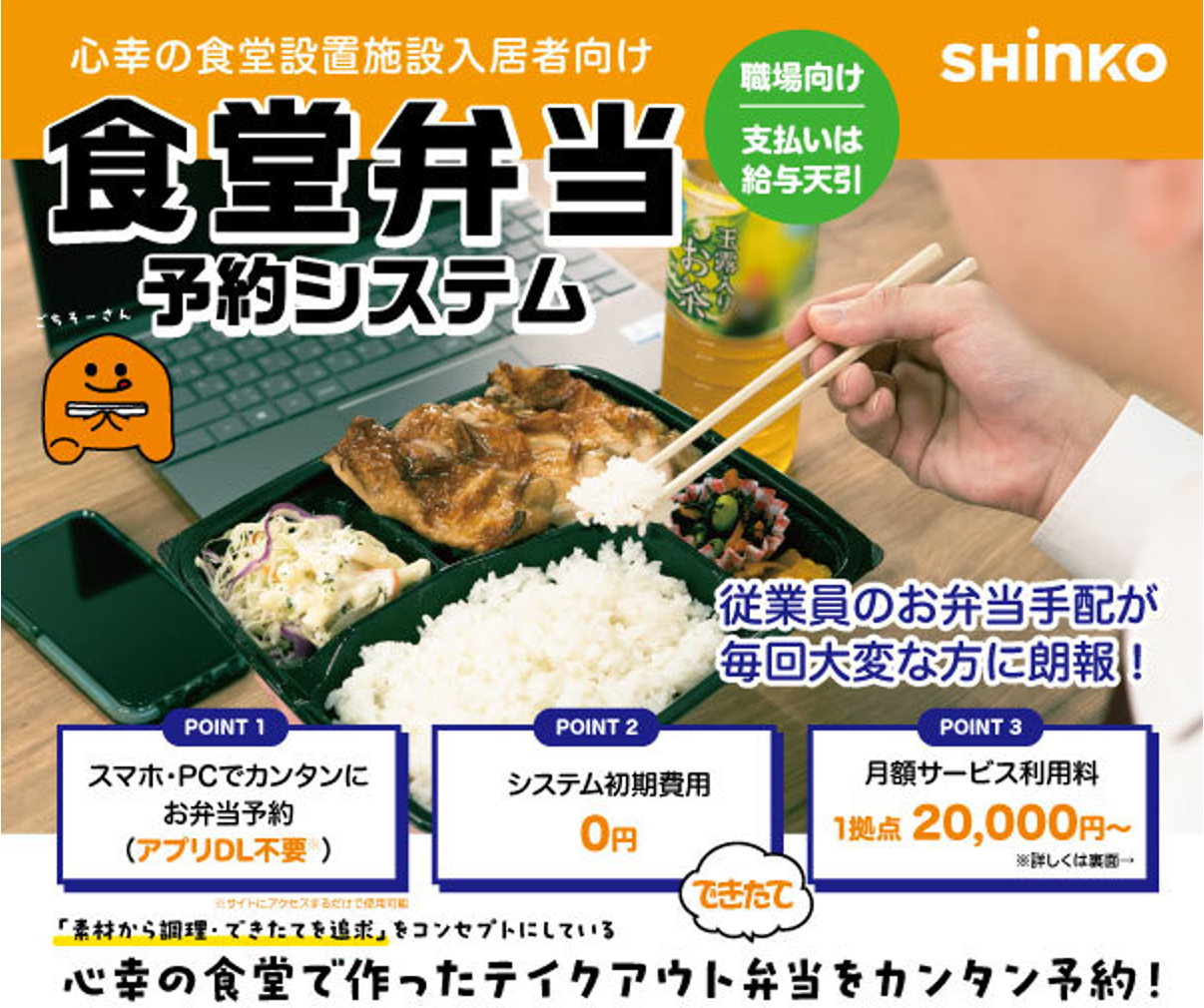 このたび新たに導入した「食堂弁当予約システム」は、心幸クリエイトが運営する企業内食堂で作ったテイクアウト弁当をスマホから簡単に予約・購入することができ、お支払いは給与天引で行なうため、拠点管理者の方などによる紙やExcelの煩雑なお弁当手配の負担を軽減するものです。「食堂メニュー決済システム」においても、心幸クリエイトが運営する社食のメニューをスマホから注文・購入できるだけでなく、給与天引を行なうため、従業員の社食代を企業が半額負担、特別な日は完全無料にするなど、自由に価格の設定が可能です。