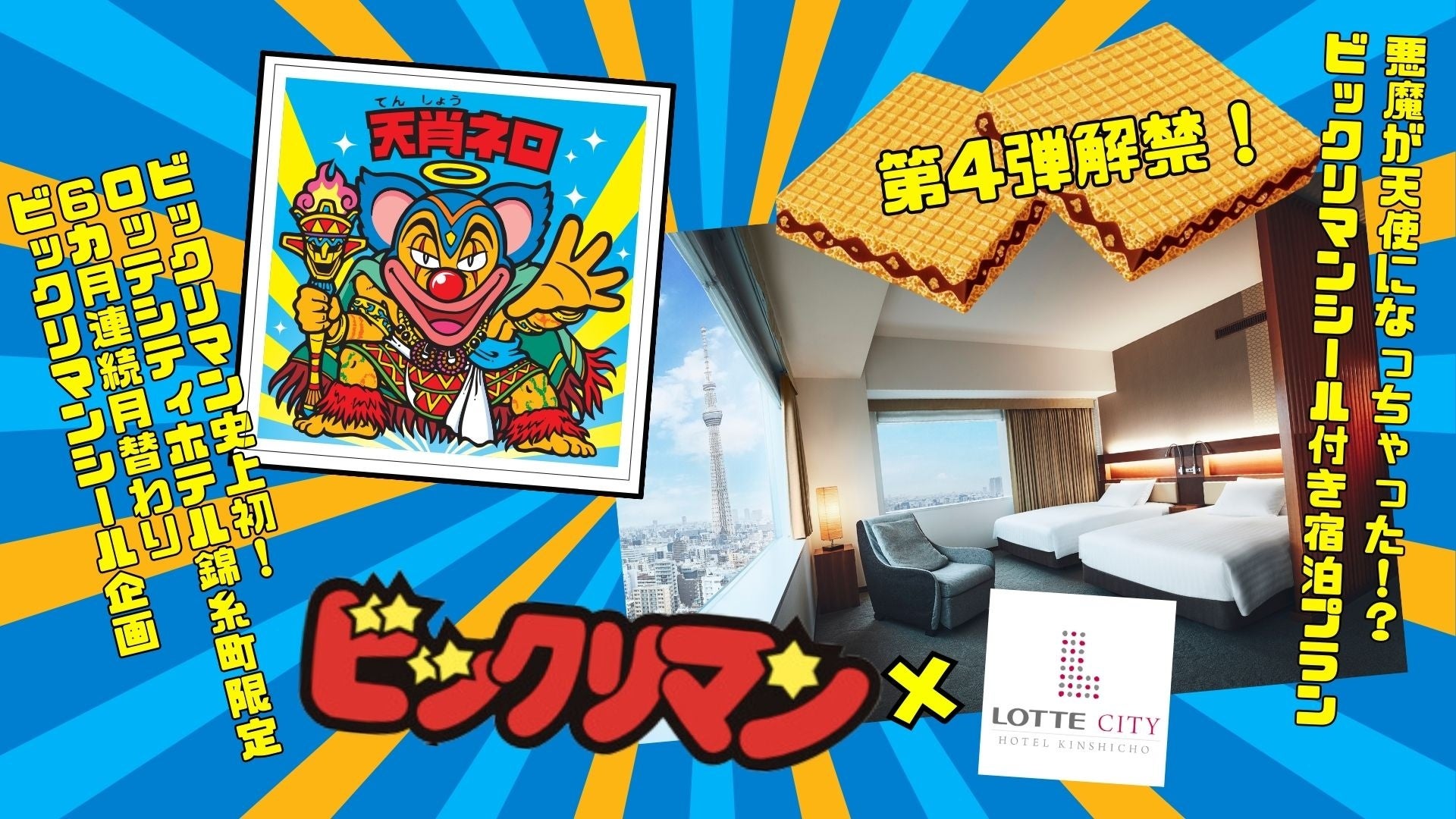 ロッテシティホテル錦糸町×ビックリマンの記念すべき初コラボは、「悪魔達もロッテシティホテルの癒しの空間で天使になっちゃった!?」をコンセプトに、ロッテシティホテル銀糸町初6ヶ月連続の“オカシ”な宿泊プランです。1日30名様限定で魔肖ネロの天使転生バージョン、「天肖ネロ」のビックリマンシールが手に入るチャンスとなっております。